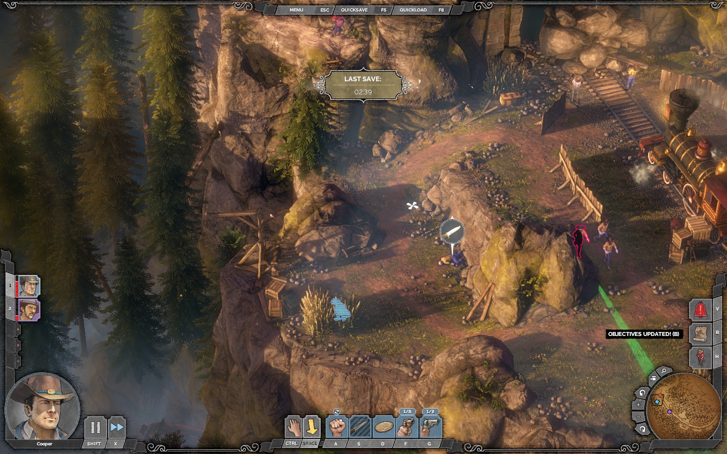 Merthogy az őrök sem mindig egyedül vannak jelen a pályákon, és ilyenkor bizony minden egyes lépésünket jól ki kell tervelni – az F5 a gyorsmentés, érdemes szoros barátságot kötni vele –, majd ha elképzeltük a mozdulatsort, nagy segítségünkre lesz a Showdown mód aktiválása, ami egyfajta új elemként jelenik meg a Desperados III-ban. Ennek részeként lehetőségünk nyílik leállítani egy kicsit az időt, és gondosan megtervezni minden karakter lépéseit, majd ha kiosztottuk a parancsokat, indulhat az akció, amivel szerencsés esetben akár 2-3 embert is likvidálhatunk egyszerre, de valamilyen pályaelem bevonásával akár még többet is. Ez a rendkívüli aprólékosság az egész játékra jellemző, itt nem szabad kapkodni vagy hősködni, fontos lesz mindent alaposan megtervezni, hiszen lehetőségünk van rá, és csak rajtunk múlik, mikor vagy mennyire élünk vele.