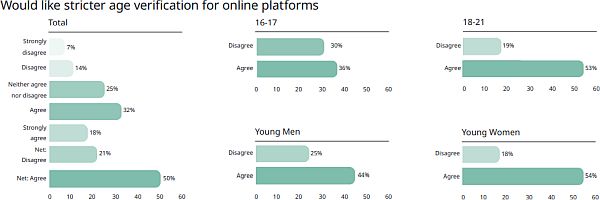 1293 fiatal megkérdezésével készült felmérés megállapította, hogy a válaszadók 27%-a osztotta meg online tartózkodási helyét idegenekkel. A háromnegyedük azt mondta, hogy a világjárvány miatt több időt töltött online, 68%-uk pedig úgy érezte, hogy az online töltött idő károsan hat a mentális egészségére. 42% mondta, hogy hazudott a koráról az interneten, 40% ismerte el, hogy volt egy ál- vagy „eldobható” fiókja, 27% pedig azt mondta, hogy teljesen más személynek adta ki magát. Az eredmények annak fényében érdekesek, hogy Peter Kyle brit technológiai miniszter utalt arra, hogy a kormány mérlegeli annak lehetőségét, hogy bizonyos alkalmazások, például a TikTok és az Instagram esetében kötelezővé tegye a szabályok közé szorítást.