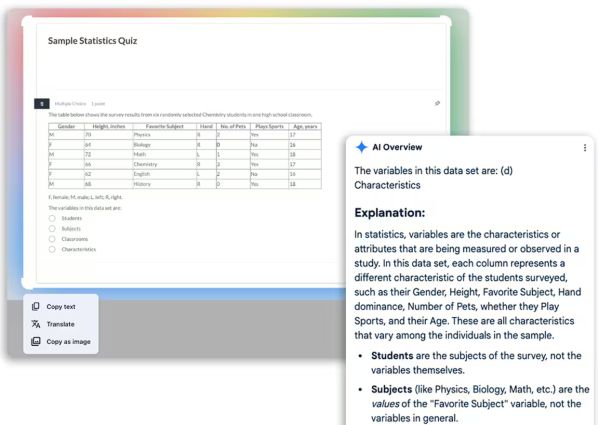 A Pew Research Center szerint tavaly ősszel a 13–17 éves tinédzserek 26 százaléka mondta, hogy iskolai feladatokhoz használja a ChatGPT-t. Ez kétszerese a 2023-as aránynak. Ezen a héten az OpenAI arról számolt be, hogy a 18 év felettiek összes ChatGPT-lekérdezése több mint 10 százaléka magántanításhoz vagy tanításhoz kapcsolódik. A Google szerint a Lens funkciója már régóta része a Chrome böngészőnek, amely lehetőséget ad az embereknek, hogy közvetlenül a weboldalakon keressenek képeket és szövegeket. Ez év elején a Google egy gombot is hozzáadott a Chrome-hoz, amely elindítja a Gemini chatbotot, amely szintén láthatja, mi van a felhasználó képernyőjén.