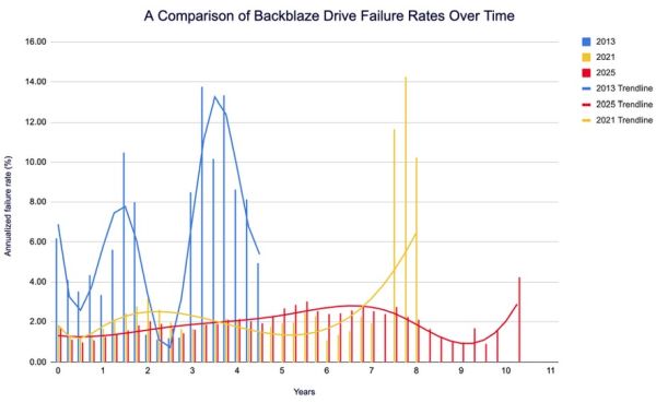 A szerzők összehasonlították a Backblaze adatközpontjában található körülbelül 317 230 meghajtó AFR-jét a vállalat által 2013-ban 21 195, 2021-ben pedig 206 928 meghajtó vizsgálata során rögzített AFR-rel. Doyle és Patterson szerint „meglehetősen jelentős eltérést azonosítottak mind a meghajtók meghibásodásának életkorában, mind az AFR legmagasabb pontjában az elmúlt két elemzéshez képest”. A tesztelt meghajtók magas meghibásodási arányának csúcsa ebben az évben 4,25 százalék volt 10 év és 3 hónap után, szemben a 2013-as 13,73 százalékkal körülbelül 3 év és 3 hónap után, valamint a 2021-es 14,24 százalékkal 7 év és 9 hónap után.