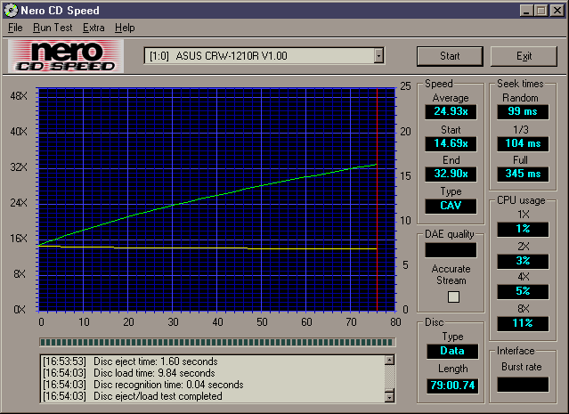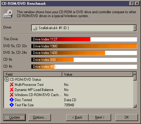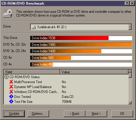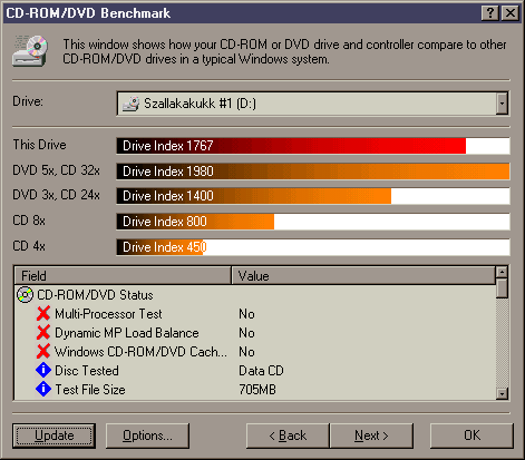Hogyan is teszteltem? Minden meghajtó a következő tortúrán kellett, hogy keresztül menjen. Sisoft Sandra CD benchmark, egy 705MB nagyságú .mpg állomány felhasználásával. 3 db Audio CD (egy gyári dinamikus szektor szinkron módban, egy írott szintén dinamikus szinkronnal, ismét egy gyári lemez "Buffered Burst" módban) teljes másolása a winchesterre Audiograbber 1.8-as program segítségével. 3 db adat CD teljes lemásolása winchesterre, melyek közül az egyik kizárólag 3-8 MB közötti méretű mp3 állományokat tartalmaz, a másik teljesen vegyes méretű (5 kB - 60 MB) állományokkal van teleírva, míg a harmadik egy rossz minőségben megírt video CD. CD speed program lefuttatása, a szokásos opciókon kívül túlírási teszt egy 74 perces Philips MultiPurpose és egy 80 perces TDK D-View nyersanyagra. Írási és újraírási teszt több sebességen, több nyersanyagra. ASUS CRW-1210R