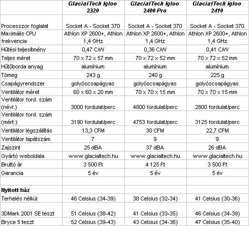 Összességében elmondható, hogy a teszteredmények nem hoztak különösebb meglepetéseket, vagyis a vártnak megfelelően a következő sorrend alakult ki a tesztre érkezett versenyzők között: Igloo 2400 Pro, Igloo 2410, Igloo 2320. Hátulról előre felé haladva először az Igloo 2320 kielégítőnek nevezhető teljesítményéről kell említést tennünk. A gyártó ezen belépőszintű modellje hozta a tőle elvárható értékeket, mindenesetre az Igloo 2320 megvásárlását csak azoknak tudom ajánlani, akik alacsonyabb hőtermelésű processzorral rendelkeznek, ugyanis a 2320-as modellnek nyári körülmények között minden bizonnyal meggyűlnek a gondjai a "kazán" kategóriás chipekkel. Végül pedig említésre méltó, hogy az Igloo 2320 mindössze 25 dBA zajt csap.