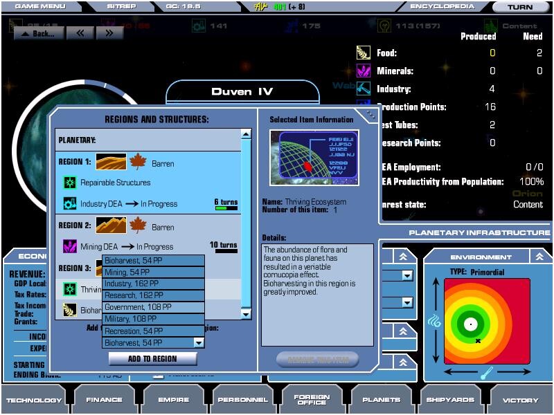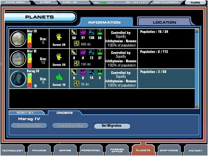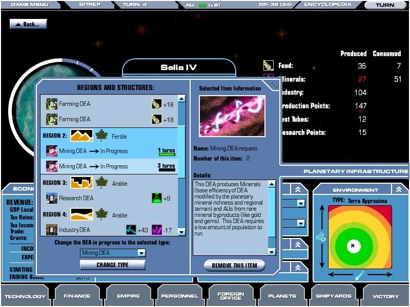 A bolygó termelékenységének alapját ezek a DEA-k adják. a farmok élelmet termelnek, a bányászok ásványi anyagokat hoznak felszínre, a gyárak az ásványi anyagok felhasználásával a termelékenységet növelik, a kutatóbázisok pedig a fejlesztéseket gyorsítják. Egyéb kategóriába tartoznak a szórakoztatóépületek, melyek a néphangulatot javítják, a kormányzati épület, ami az adók nagyságát növeli és a katonai létesítmény, ami a védelmi képességekre és a lázadás esélyének csökkentésére van nagy hatással. Mi csupán a DEA típusát változtathajuk meg, a bővítményeinek építését teljes mértékben az AI, vagyis a bolygó kormányzója határozza meg attól függően, milyen prioritásokat állítunk be birodalmunkban és mennyi pénzt forgatunk vissza a birodalmi adókból. Az AI kikapcsolása ugyan lehetséges, de semmiképpen sem ajánlott, mivel a mikromenedzsment, a bolygók egyedi kezelése több csillagrendszer esetén szinte lehetetlen, és igen unalmas. A bolygókon túljutva, ismerkedjünk meg az alsó menükkel: