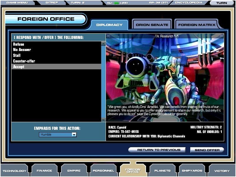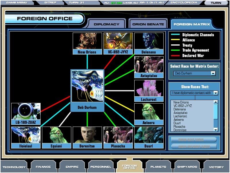 Diplomácia: Más birodalmakkal meglévő kapcsolataink alakulását kísérhetjük figyelemmel. Sokféle stílusban intézhetünk üzeneteket más játékosokhoz, és ha már tagok vagyunk a szenátusban, beadványokat terjeszthetünk az Orion tanács elé, melyek minden meglévő birodalomra kihatnak. A fajok között áthidalhatatlan ellentétek is vannak, pl. a Saurian ki nem állhatja az Ichthytosian fajba tartozót, az emberek pedig nem kedvelik a Cybernetikeket, de jóban vannak a Saurianokkal. Ha elég erősek vagyunk és elég szövetségesünk van, akár úgy is megnyerhetjük a játékot hogy megválasztanak a szenátus elnökévé.