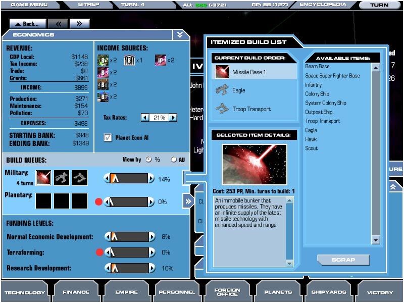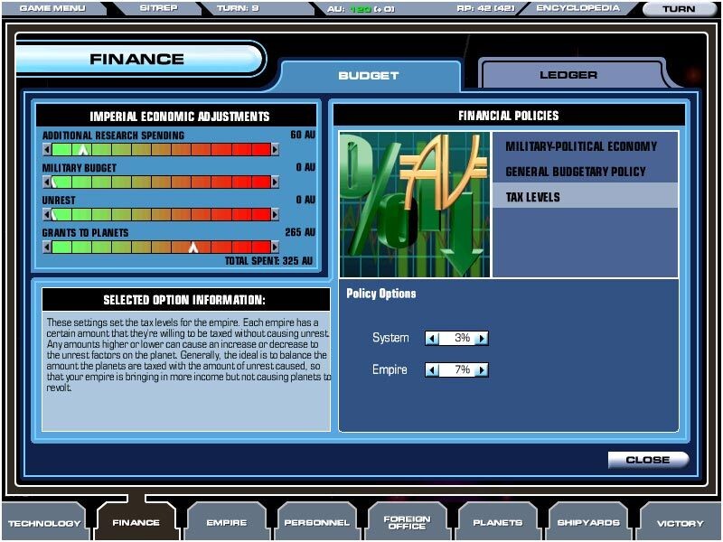 Pénzügyek: A birodalmi bevételek elosztásának képernyője. Beállíthatjuk az adók mértékét, és a befolyó pénzösszegeket használhatjuk a kutatás gyorsítására, a lázadások mértékének csökkentésére (igen drága módszer, de néha szükséges) és a bolygók infrastruktúrális fejlesztésének növelésére. Itt tekinthetjük meg bevételeink és kiadásaink táblázatát is.