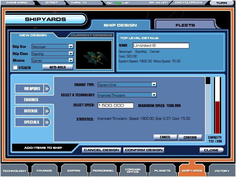 Űrkikötő: Az űrhajótervek készítésének menüpontja, itt szerelhetjük fel meglévő hajótípusainkat korszerübb eszközökkel, és tervezhetünk teljesen új konstrukciókat. A kezelés ugyan nagyon jó, de túl sokszor kell szükségtelenül használni; rengeteg újítás van, ezért ha mindig új hajókat akarunk, rendszeresen át kell dolgoznunk a régi terveket, és ez nagyon unalmassá válhat.