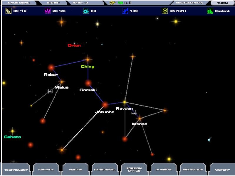 A faj kiválasztása után a főképernyőre jutunk, amit amikor megláttam, enyhén meglepődtem. A játékban a ma oly divatos 3D megjelenítésnek szikráját se látni, ami egy stratégiai játékban nem is lenne baj, de ehhez hasonló színvonalú grafikát utoljára talán tíz éve láttam. Az egész játékra jellemző ez a puritán célszerűség, és a csili-vili megjelenés nélkül méginkább kiütközik bonyolultsága és sokrétűsége. A főképernyőn a csillagokat láthatjuk, köztük vonalakkal - ezek az ismert útvonalak. Egy csillagra duplán ráklikkelve a "naprendszer" menüjébe jutunk, ahol bal felül a csillag maga, körülötte pedig a bolyók (ha vannak) helyezkednek el koncentrikus körökben. A játék bonyolultságára jellemző ennek a következetes megtervezése: a bolygórendszer teljes mértékben a csillagtól függ, melynek adatai (hőfoka, nagysága, típusa) határozzák meg a bolygók lakhatóságát fajunk számára. (Egy fehér szuperóriás körül nem nagyon találhatunk az ember számára kellemes helyet, de más fajok számára tökéletes kősziklát vagy gázóriást annál inkább.)