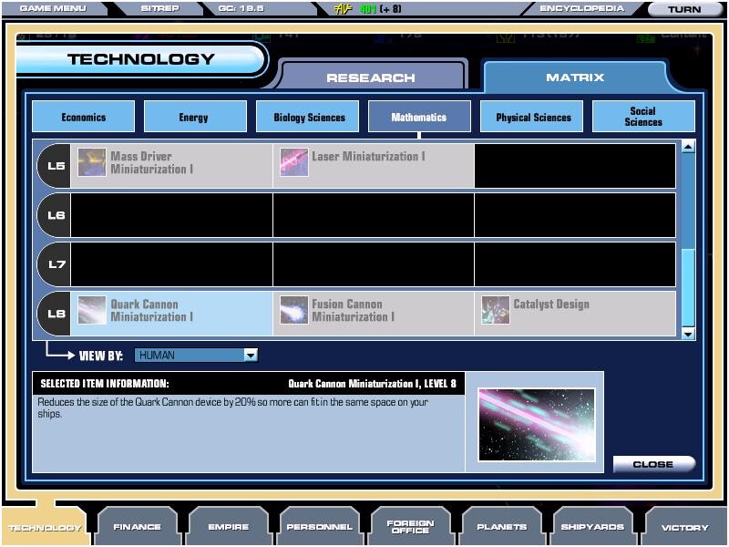 Technológia: Itt állíthatjuk be a fejlesztési irányokat, hat különbözo terület között (gazdaság, energetika, biológia, matematika, fizika és szociológia) kell felosztanunk a kutatásra szánt pénzt. Nem mi határozzuk meg mikor mit kutassanak, mi csupán a pénzt adjuk, és a területet határozzuk meg. A játékra általában is jellemző ez a szemlélet, miszerint mi csupán uralkodók, szabályozók vagyunk, de a dolgokat ténylegesen mélységében nem tudjuk, illetve nem szükséges irányítani. A technológiai mátrix alapján kiválóan láthatjuk mikor mi következik, mire érdemes több pénzt szánni, és természtesen vannak keresztfüggések is, bizonyos nagyobb találmányokhoz egy másik területen is eredményeket kell elérnünk. A találmányok leírása igen hiányos, kevés konkrét információval szolgál. Két érdekes csavar van: számos újítás nem a várt szinten van, azaz játékonként eltérő fejlettséget igényel, másik hogy a technológiai fa csupán 3-4 szinttel látszik előre, tehát fogalmunk sincs, mi jön utána. Több mint 380 lehetséges fejlesztés van, melyek fajonként is eltérőek - bőven van újrajátszási lehetőség.