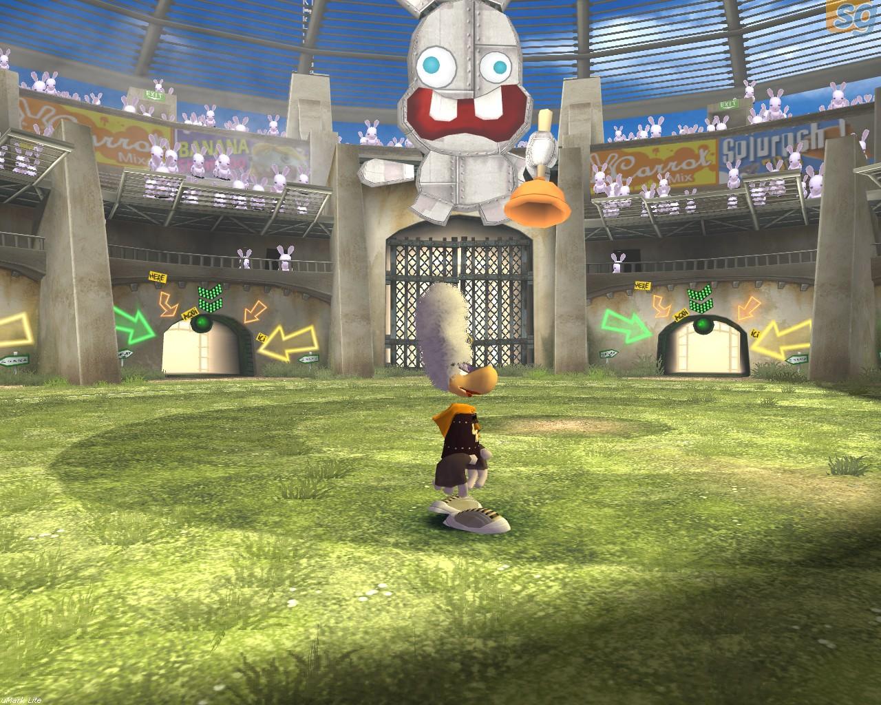 Van történet is. Rayman éppen kis bogyóbarátaival piknikezik, mikor egy váratlan pillanatban cimborái eltűnnek a föld alá, helyükön pedig őrült nyulak bukkannak fel, akik elrabolják főhősünket. A videoklipekből ismert nyuszik nem valami barátságos lények, viszont annál hülyébbek tudnak lenni. Az IQ-juk körülbelül 3,5-3,6 lehet, de odáig már eljutottak, hogy tömegesen szórakozzanak arénákban foglyul ejtett lények próbák elé állításán. Rayman is így kezdi, kis cellájából minden nap kirángatják és 5 próbát kell teljesítenie, hogy visszajuthasson szerény kis hajlékába. Eleinte kemény fúúújolás és utálat fogadja, de ahogy telnek-múlnak a napok, egyre népszerűbbé válik, sőt az "I love Ray" transzparens sem lesz később ritka.