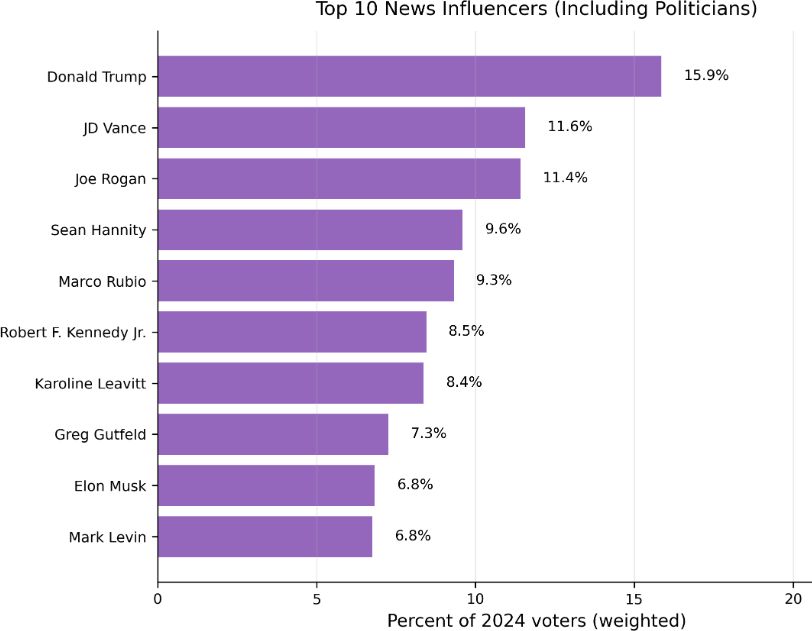 A márciusban végzett kutatás szerint a konzervatív politikusok és kormányzati tisztségviselők - köztük Donald Trump - a legfontosabb hírformáló személyiségek közé tartoznak. Amikor a politikusokat kizárták a listából, Joe Rogan került az élre, őt követték a Fox News műsorvezetői, Greg Gutfeld és Sean Hannity, majd Tucker Carlson és Ben Shapiro. Mindössze három szereplő ért el 10 százalékos arányt: Trump, Rogan és JD Vance. Azok körében, akik Kamala Harris mellett szavaztak, a legnépszerűbb hírforrásnak számító személyiségek az éjszakai talk show műsorvezetők voltak. A listát az ABC csatorna műsorvezetője, Jimmy Kimmel vezette, őt követte a CBS Late Show házigazdája, Stephen Colbert, valamint a The Daily Show vezetője, Jon Stewart.