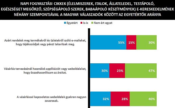 A valóságos üzletek és az e-kereskedelem szoros együttélését igazolja, hogy a magyar megkérdezettek majdnem kétharmada gyakran megnéz a neten egy-egy napi fogyasztási cikket, mielőtt boltban megvenné. De fordított irányban is tájékozódnak: a magyarok közel fele gyakran megnéz egy élelmiszert, italt vagy testápoló szert valamilyen üzletben, mielőtt online megvásárolná. Figyelemre méltóan magas (60 százalékkal nagyobb) arányban értenek egyet az e-kereskedelemmel kapcsolatban a magyar megkérdezettek a következőkkel: Nincs bizalmuk ahhoz, hogy hitelkártyájuk adatait online megadják. Továbbá vásárlás előtt viszonylag sok időt töltenek azzal, hogy interneten keresgélnek termékeket.