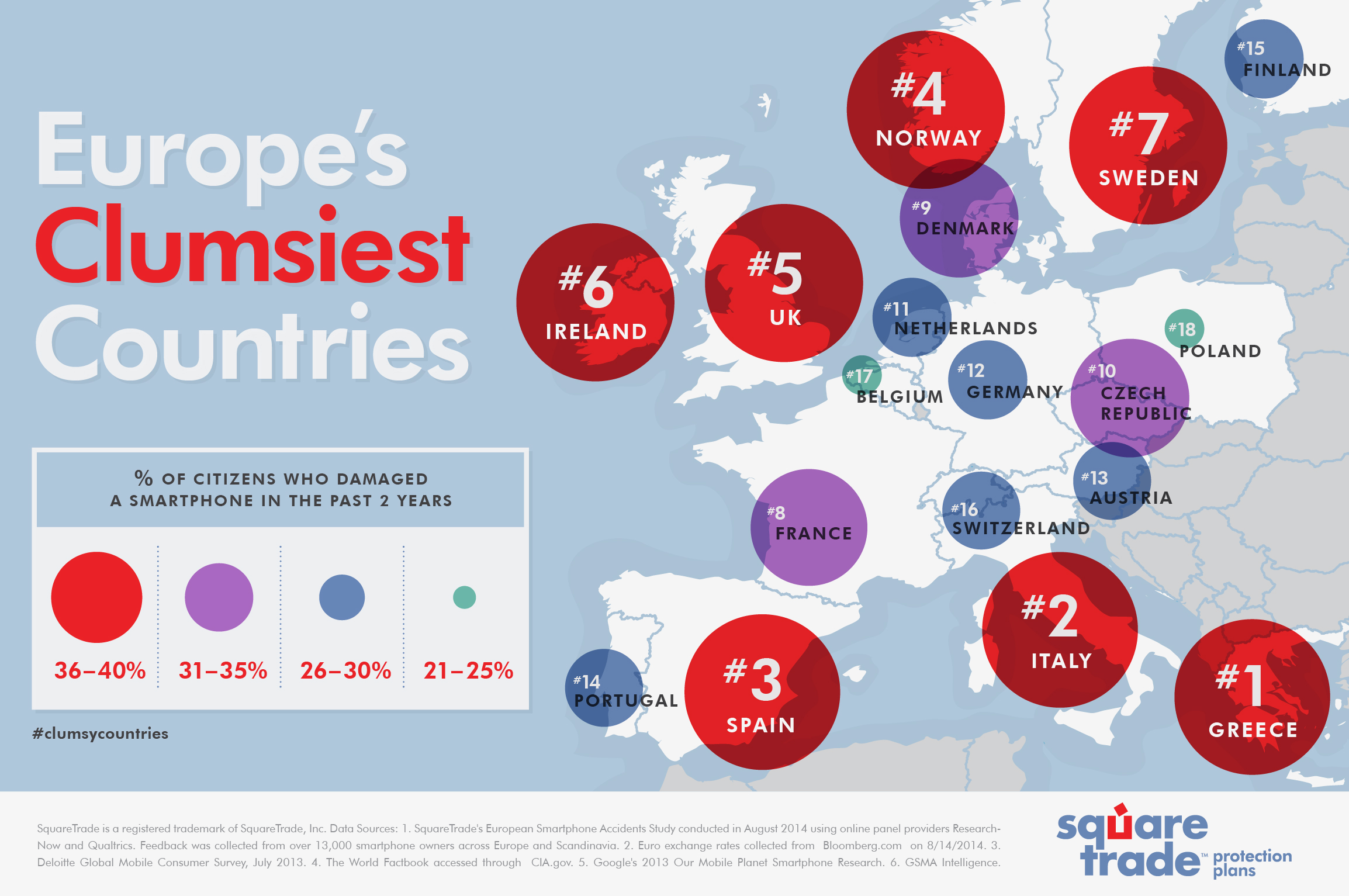 A megvizsgált európai államok térképéről ugyan hazánk lemaradt, de néhány szomszédunkat és régiós vetélytársunkat szemügyre vehetjük azon. Rögtön szembetűnik a különbség a déli és a kontinens középső részét elfoglaló országok között, bár a földrajzi elhelyezkedés nem feltétlenül mutat ilyen összefüggéseket. Kiemelendő azonban, hogy míg a görögök esetében az elmúlt 2 évben az okostelefonokat használók 40 százalékának sikerült figyelmetlensége miatt kárt okoznia saját készülékében, addig ez az arány a lengyelek esetében csak 24,3 százalék, a belgáknál pedig 24,9 százalék.