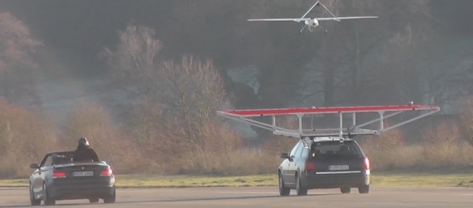 A DLR Robotikai és Mechatronikai Intézetének munkatársai a robotika és a pilóta nélküli repülőgépek technológiáit ötvözték egymással, s egy olyan rendszert fejlesztettek ki, amely lehetővé teszi, hogy egy merevszárnyú repülőgép leszállhasson egy mozgó autóra. A technikát egy 3 méteres, 20 kilogramm súlyú drónnal tesztelték, míg a gépkocsi tetejére egy elfogó hálót feszítettek ki. A járművet számos optikai szenzorral is ellátták.