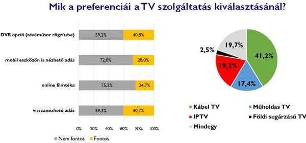 A televíziós szolgáltatások körében továbbra is a kábeltévék iránt a legnagyobb az érdeklődés (41%), ugyanakkor egyre nagyobb az igény az internet alapú (IPTV) szolgáltatás (19%) iránt is. A műholdon keresztül elérhető tévészolgáltatásokat az ügyfelek 17 százaléka preferálja. Mivel ma már a háztartások 83 százaléka rendelkezik digitális vétellel, ami számos hozzáadott szolgáltatást is lehetővé tesz, a tévészolgáltatás kiválasztása során ezek a szempontok is egyre nagyobb szerepet játszanak. A válaszadók negyven százaléka tartja fontosnak a rögzíthető/visszanézhető műsorok lehetőségét. Az olyan kiegészítő lehetőségek, mint az online filmtéka (25%), vagy a mobil eszközökön is nézhető adás (28%) iránt ugyanakkor egyelőre nem tapasztalható kiemelkedő mértékű érdeklődés.