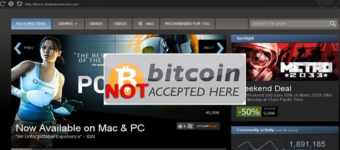 A Valve bejelentette, hogy azonnali hatállyal beszüntette a Steam rendszerében a bitcoin elfogadását. A cég az egyik indokként a virtuális fizetőeszköz "illékonyságát" nevezte meg, míg a másik indokként azt, hogy a bitcoin-hálózatban jelentős mértékben megemelkedtek a tranzakciós díjak. Mindkét dolog problémákhoz vezet az ügyfelekkel.