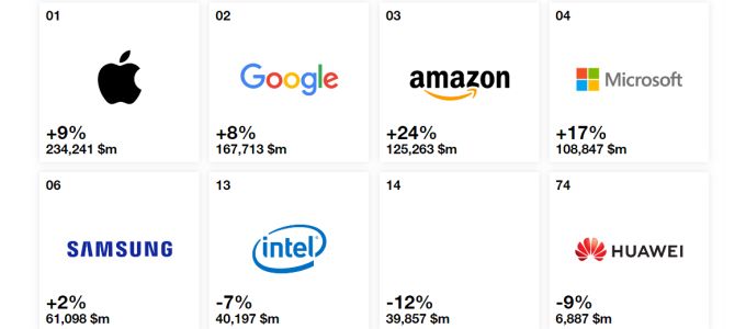 A 100 vállalatot rangsoroló "Best Global Brands" globális márkarangsorban az első helyen az Apple áll, a márka értéke 234,241 milliárd dollár, 9 százalékkal több a tavalyinál. A második helyezett Google márka értéke 8 százalékkal, 167,713 milliárd dollárra emelkedett. Tavalyhoz hasonlóan az idén is harmadik helyezett az Amazon, amelynek értéke 24 százalékkal, 125,263 milliárd dollárra nőtt. Nincs változás a következő öt helyen sem: 4. a Microsoft (108,8 milliárd dollár, tavalyhoz képest plusz 17 százalék), 5. a Coca-Cola (63,4 milliárd dollár, mínusz 4 százalék), 6. a Samsung (61,1 milliárd dollár, plusz 2 százalék), 7. a Toyota (56,2 milliárd dollár, plusz 5 százalék, a 8. pedig a Mercedes-Benz (50,8 milliárd dollár, plusz 5 százalék).