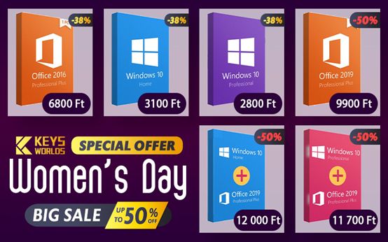 A Keysworlds több árut hozott forgalomba a Nemzetközi Nőnap alkalmából, termékkulcsokat a Windows 10-től az Office 2019-ig. Vessen egy pillantást a Nőnapon elérhető legfontosabb ajánlatokra.