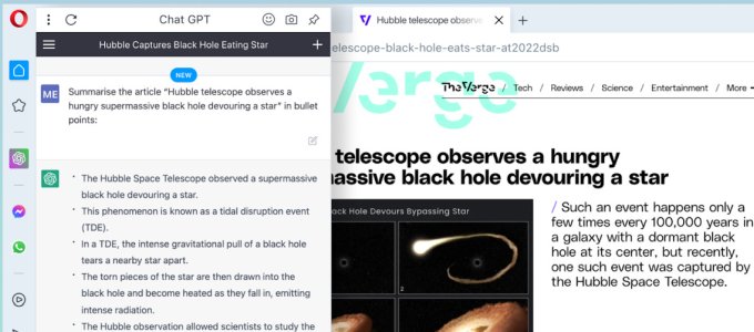 Mint arról beszámoltunk, a ChatGPT nevű chatbotot integrálja a Bingbe a Microsoft, majd nemrég kiderült, hogy a Google és a Baidu is hasonló lépésre készül a saját fejlesztései keresőkbe való integrálásával. Most az Opera bejelentette, hogy több mesterséges intelligencia funkcióval is bővíteni akarja a böngészőjét, ezért integrálja a szoftverbe a ChatGPT nevű mesterséges intelligenciát. Az eszköz tömören össze tudja foglalni egy weboldal tartalmát, de a technológiát alkalmazzák a böngészőablakban megnyitott cikk zanzásítására is. Az összefoglaló az oldalsávban jelenik meg. Az eszköz a címsor jobb oldalán található "Rövidítés" gombra kattintva aktiválható. Ekkor a böngészőablak bal oldalán megnyílik egy oldalsáv, amely megmutatja az áttekinthető összefoglalót.