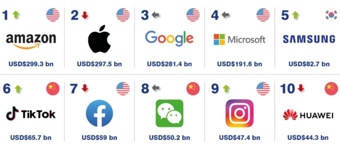 Ötödik a Samsung (82,7 milliárd dollár), hatodik a TikTok (65,7 milliárd dollár), hetedik a Facebook (59 milliárd dollár), nyolcadik a WeChat kínai csevegőszolgáltató (50,2 milliárd dollár), a kilencedik az Instagram (47,4 milliárd dollár), a tízedik pedig a Huawei (44,3 milliárd dollár).