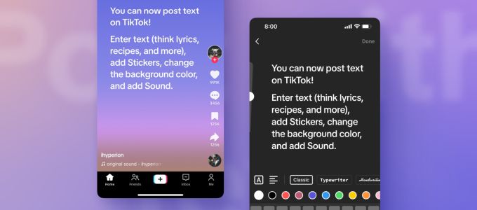 A TikTok felhasználói mostantól a videók és fotósorozatok mellett szöveges frissítéseket is posztolhatnak. Persze hogy ezek kellően illeszkedjenek a táncikálós videók mellé, a tinik ezeket is feldobhatják villogó dolgokkal, és így a szöveges posztok vizuálisan az Instagram Stories-hoz hasonlóan jelennek meg. A felhasználók háttérszínt adhatnak hozzá, szerkeszthetik a szöveg megjelenési módját, valamint zenét és matricákat adhatnak a bejegyzéshez. Esszéket nem lehet írni, a posztoknak 1000 karakteres korlátja van. Más felhasználók is csatlakozhatnak hozzá, hasonlóan ahhoz, ahogyan a videókkal interakcióba lépnek - összefűzve, duettezve(?) és kommentálva.