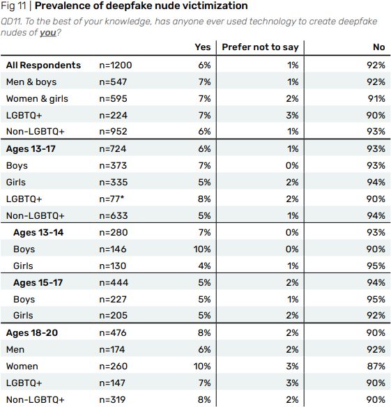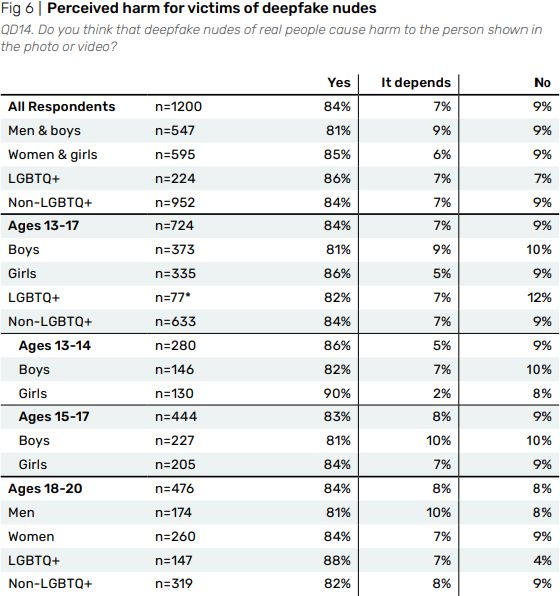 De ahogyan a barátaik és osztálytársaik kárt szenvednek, úgy tűnik, sok tizenéves kezdi megérteni, hogy a mesterséges intelligencia használata a beleegyezés nélküli aktfotók létrehozására nem oké. Egy 1200, 13-20 év közötti fiatal körében végzett felmérés eredményei szerint a válaszadók 84 százaléka „túlnyomórészt felismeri”, hogy a deepfake aktfotók olyan visszaélésnek minősülnek, amely kárt okoz az ábrázolt áldozatnak. A fiatalok számára a deepfake aktfotók készítése még nem normalizálódott. A Thorn felmérése azonban, amely szerint a megkérdezett fiatalok 10 százaléka személyesen ismer áldozatot, azt sugallja, hogy „valószínűbb, hogy ez szinte minden iskolarendszerben megtörténik az országban”, és valószínűleg „minden városban volt legalább egy olyan személy, aki valamilyen módon vagy formában célpont volt” - vetette fel. "Még ha egyetlen személy hozza is létre, és egyetlen személy a célpont, valószínűleg az egész közösségben elterjed” - mondta, azt sugallva, hogy az ilyen nem konszenzuális megosztás "exponenciálisan növeli az érintett gyerekek számát és az ábrázolt gyermeknek okozott kár mértékét."