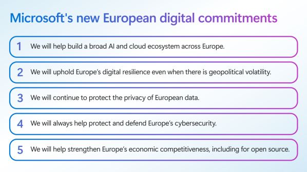 „A geopolitikai bizonytalanság idején elkötelezettek vagyunk a digitális stabilitás biztosítása mellett. Ezért a Microsoft ma öt digitális kötelezettségvállalást jelent be Európának. Ezek a felhő- és mesterséges intelligencia-infrastruktúránk európai bővítésével kezdődnek, amelynek célja, hogy minden ország teljes mértékben kihasználhassa ezeket a technológiákat gazdasági versenyképességének erősítése érdekében. És tartalmaznak egy ígéretet arra, hogy a geopolitikai és kereskedelmi ingadozásoktól függetlenül fenntartjuk Európa digitális ellenálló képességét.” A Microsoft "örömmel” vette tudomásul, hogy a Trump-kormányzat és az Európai Unió megállapodott abban, hogy „felfüggesztik a további vámemelést”, miközben a tisztviselők „tárgyalásokat folytatnak egy kölcsönös kereskedelmi megállapodásról”, hogy „megoldják a vámkérdéseket és csökkentsék a nem vámjellegű akadályokat”.