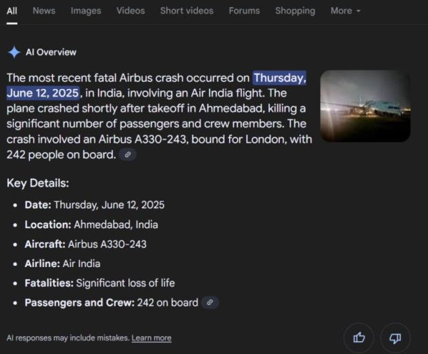 Amikor jelentős események történnek, a legtöbb ember a Google-hoz rohan, hogy információt találjon. Egyre gyakrabban az első dolog, amit látnak, az egy mesterséges intelligencia áttekintés, egy olyan funkció, amely már hírhedt arról, hogy kirívó hibákat követ el. (Az Apple összefoglalója hasonlóan béna.) A tegnapi tragikus indiai repülőgép-szerencsétlenséget követően a Google MI-összefoglalója téves információkat terjeszt, azt állítva, hogy az incidens egy Airbus repülőgépet érintett - pedig valójában egy Boeing 787-es volt.