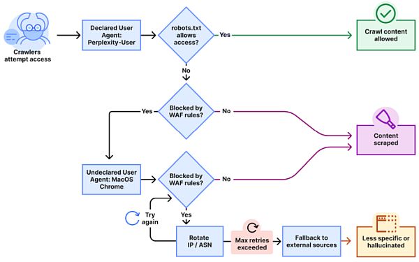 "Egy nem bejelentett bot több, a Perplexity hivatalos IP-tartományában nem szereplő IP-címet használt, és ezeket az IP-címeket váltogatta a korlátozó robots.txt-szabályzatra és a Cloudflare blokkolására reagálva” - írják a kutatók. "Az IP-címek váltogatásán túlmenően megfigyeltük, hogy különböző ASN-ekről érkező kérésekkel is megpróbálták kijátszani a webhelyek blokkolását. Ez a tevékenység több tízezer domainen és naponta több millió kérésben volt megfigyelhető.” A kutatók a következő ábrával illusztrálták azt a technikát, amelyet állításuk szerint a Perplexity használt.
