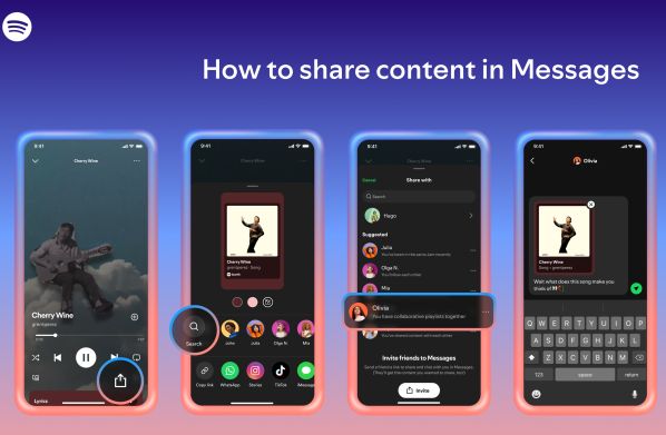 Az üzenetküldő funkcióhoz úgy lehet hozzáférni, hogy a „Most lejátszott” nézetben egy dal, podcast vagy hangoskönyv hallgatása közben megérintjük a megosztás ikont, majd kiválasztjuk azt a barátot, akinek elküldjük. A Spotify felhasználók megoszthatnak tartalmakat és üzeneteket indíthatnak azoknak az embereknek, akikkel megosztják a Spotify előfizetésüket, vagy más felhasználóknak, akikkel korábban már kapcsolatba kerültek a Spotify-on keresztül, például a Jams, Blends és Collaborative Playlists szolgáltatásokon keresztül.