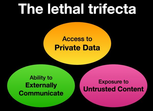 Simon Willison, a Python szoftver alapítvány igazgatótanácsának tagja, független MI-kutató, a külső tartalmakhoz való hozzáférés, a magánadatokhoz való hozzáférés és a külvilággal való kommunikáció kombinációját „halálos triónak” nevezi. Júniusban a Microsoft csendben kiadott egy javítást a Copilot nevű csevegőrobotjában felfedezett ilyen hármasra. A sebezhetőséget soha nem használták ki „a valós életben” - állította a Microsoft, megnyugtatva ügyfeleit, hogy a problémát kijavították, és adataik biztonságban vannak. De a Copilot halálos hármasa véletlenül jött létre, és a Microsoft képes volt kijavítani a réseket és visszaverni a lehetséges támadókat.