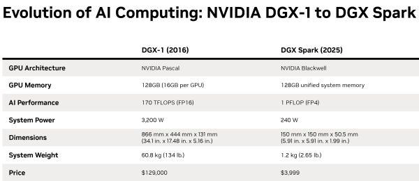 Az Nvidia bejelentette, hogy megkezdi a megrendelések felvételét a DGX Spark-ra, mely egy 4000 dollárba kerülő asztali mesterséges intelligencia számítógép. 1 petaflop számítási teljesítményt és 128 GB egységes memóriát tartalmaz egy olyan formában, amely elég kicsi ahhoz, hogy elférjen egy asztalon. A legnagyobb előnye valószínűleg a nagy integrált memóriája, amely nagyobb mesterséges intelligencia modelleket futtathat, mint a fogyasztói GPU-k. A DGX Sparkot a cég januárban „Project DIGITS” néven mutatta be, és májusban adott neki hivatalos nevet. Ez az Nvidia nagy kísérlete egy új kategóriájú asztali számítógépes munkaállomás létrehozására, kifejezetten MI-fejlesztés céljára.