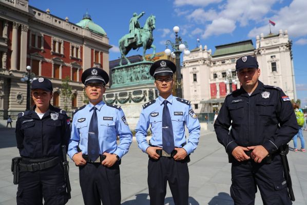 Kínai rendőrök szerb rendőrökkel a belgrádi Köztársaság téren, Szerbiában
