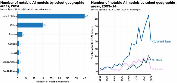 A Stanford Egyetem 2025-ös Mesterséges Intelligencia Index Jelentése szerint 2024-ben az Egyesült Államok 40 „jelentős MI-modellt” hozott létre, szemben Kína 15 modelljével és Európa mindössze három modelljével. Az összes amerikai technológiai vállalat 11 százalékának európai alapítói vannak, és több száz, Európában indult ígéretes vállalat - köztük sok, amely közvetlenül MI-vel foglalkozik - költözött át az Egyesült Államokba. „Azok az emberek, akik részesei akarnak lenni az MI-forradalomnak az Egyesült Államokba jönnek” - mondja Florian Juengermann, egy másik Németországból származó kivándorló, aki a Listen Labs, egy ügyfélkutatással foglalkozó MI-cég társalapítója. „Egy kicsit szomorú is vagyok emiatt, őszintén szólva, Németország miatt.”