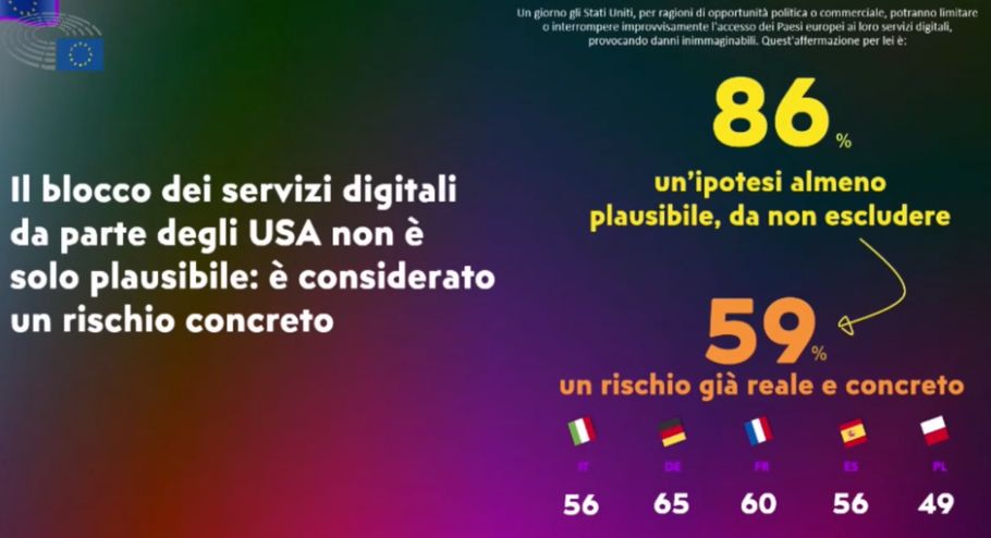 A megkérdezettek 86 százaléka szerint egy hirtelen amerikai lépés, amely korlátozná Európa hozzáférését a digitális szolgáltatásokhoz, "valószínű" és "nem zárható ki", míg 59 százalékuk ezt "már most is valós és kézzelfogható kockázatnak" nevezte abban a felmérésben, amelyet az SWG és a Polling Europe készített, és amelyet ezen a héten mutattak be az Európai Parlament képviselőinek. A felmérés 5079 válaszadót kérdezett meg mind a 27 uniós tagállamban januárban. A megkérdezettek 55 százaléka szerint egy "európai út" kijelölése mára "központi stratégiai kérdéssé" vált.