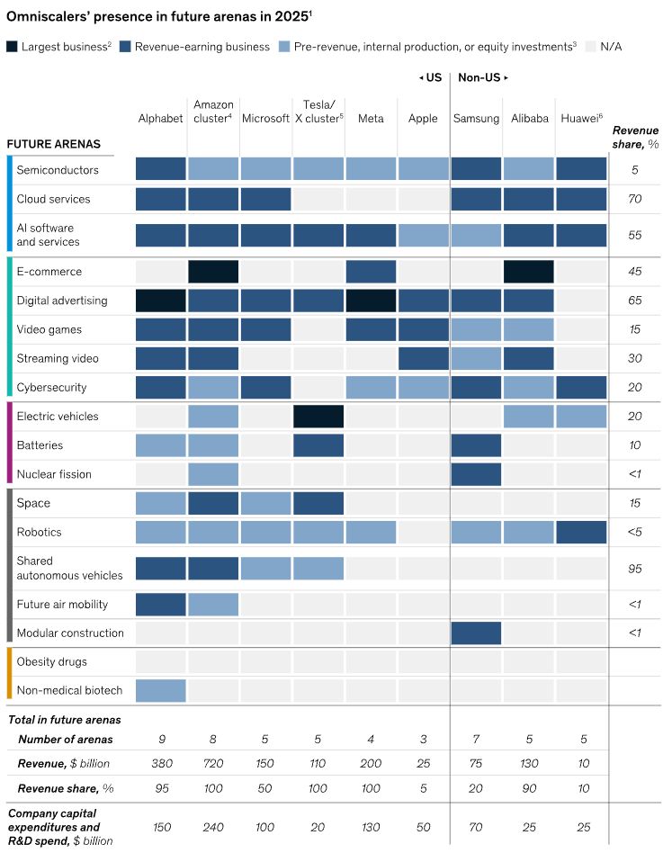 Ezt a jelenséget elemzi részletesen a McKinsey Global Institute friss jelentése is. A kutatás szerzői korábban már különbséget tettek az úgynevezett varázsló cégek és a hétköznapi vállalatok között, utalva arra, hogy bizonyos cégek technológiai képességeik révén szinte mágikus előnyre tesznek szert. Most azonban ennél is tovább mennek, és kilenc úgynevezett szupervarázsló vállalatot azonosítanak, amelyek hatalmas erőforrásokkal rendelkeznek, és a jövő leggyorsabban növekvő piacainak jelentős részét uralhatják. Ezeket a cégeket gyakran omniscalernek, azaz globális skálázónak nevezik. Ide tartozik hat amerikai vállalat, köztük a Alphabet, az Amazon, az Apple, a Microsoft, a Meta, valamint a Tesla és SpaceX köré szerveződő csoport. Ázsiából három óriás egészíti ki a listát, a Alibaba, a Huawei és a Samsung.