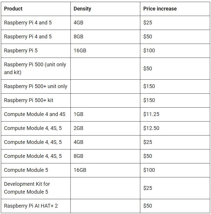 Az áremelések a Pi 4 és Pi 5 termékcsalád jelentős részét érintik. A csúcsmodellnek számító Pi 500+ ára 150 dollárral nőtt, és még a szerényebb 1 GB-os Compute Module 4 és 4S ára is 11,25 dollárral emelkedett. Az áremelés érinti a nemrég megjelent Pi AI HAT+ 2 kiegészítőt is, amely 50 dollárral lett drágább.