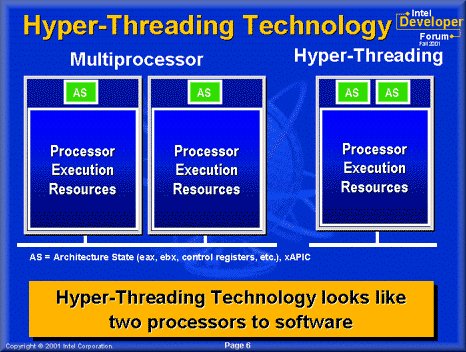 A helyzet ironikus, hiszen a technológia éppen a teljesítmény növelésére, a programok futási sebességének gyorsítására szolgál, nemcsak a szervereknél, de még az asztali gépeknél is. Ahogy az Intel ismertetője fogalmaz, segítségével gyorsabbá és hatékonyabbá tehetjük PC-nket, mégpedig a processzor erőforrásainak maximalizálásával és két külön szoftverlánc egyetlen processzorral történő párhuzamos futtatásával. Az erre felkészített szoftverek két külön processzornak látják a CPU-t, és ki is használják az ebből adódó lehetőségeket.