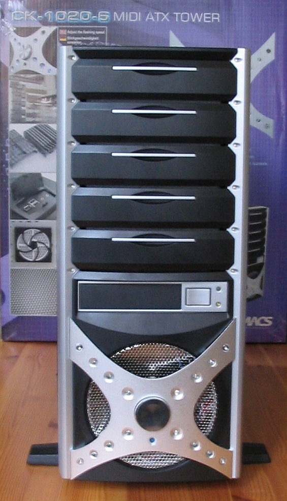 A Chieftec termékével ellentétben a Casetek CK-1020-6 igazi gigász. Habár mindkettő a MIDI szegmensbe tartozik, utóbbi már-már a kategória határait feszegeti. Szélessége majd' másfélszeres, 26 cm, magassága 65, mélysége pedig 54,5 cm, de az anyagot se spóroták ki belőle, oldalfala 1 mm vastag acél: tömege 16,5 kg. Ennek köszönhetően rezonanciára kevéssé hajlamos, elektromágneses árnyékolása kiváló. A termékre máskülönben is leginkább az előzőek ellentetje igaz: előlapján hatalmas csillogó ventilátor, melyet az átlósan keresztbefutó, éjszaka kéken világító LED-ekkel telerakott csillogó fémpánt még jobban kiemel. A legmegdöbbentőbb számomra az X közepén lévő, könnyedén levehető szabályzó funkciója volt: a lámpácskák villogásának gyorsaságát befolyásolja, az alatta lévő kis fekete lyukban pedig a fényerő nagyságát állíthatjuk be.