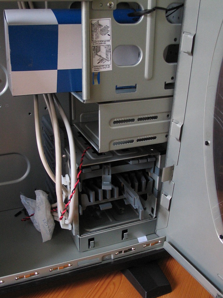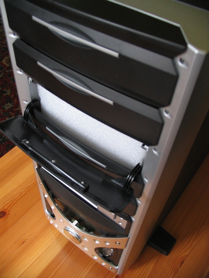A ház tetején lévő kéményben a gyártótól már megszokott módon két USB, hang és FireWire kivezetések vannak. Nagyságának megfelelően a belerakható merevlemezek terén sem okoz csalódást, kivűl öt 5,25"-os és két 3,5"-os bővítőhely van, belül pedig további három 3,5"-os winchesternek találhatunk helyet. Jó megoldás, hogy a külső meghajtókat lehajtható műanyaglemezek alatt rejthetjük el. A ház szereléséhez nem kell csavarhúzó, a merevlemezek rögzítése műanyag ketreccel történik, de az oldalra fordított elhelyezés miatt itt fokozottan kell figyelni a kábelek megtörésére.