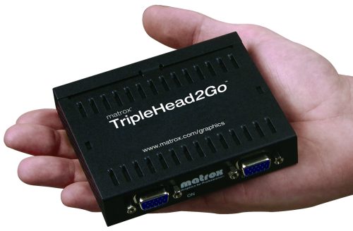 A Matrox TripleHead2Go névre keresztelt megoldása egy Palm méretű elosztót takar, amely egy D-Sub bemenetével és három kimenetével három kijelző csatlakoztatását engedélyezi egyetlen átlagos grafikus kártyához. A cég, amely korábban saját chipjeivel igyekezett meghódítani a piacot, most abban bízik, hogy érdekes újítása felkelti a játékosok és a kiadók érdeklődését.
