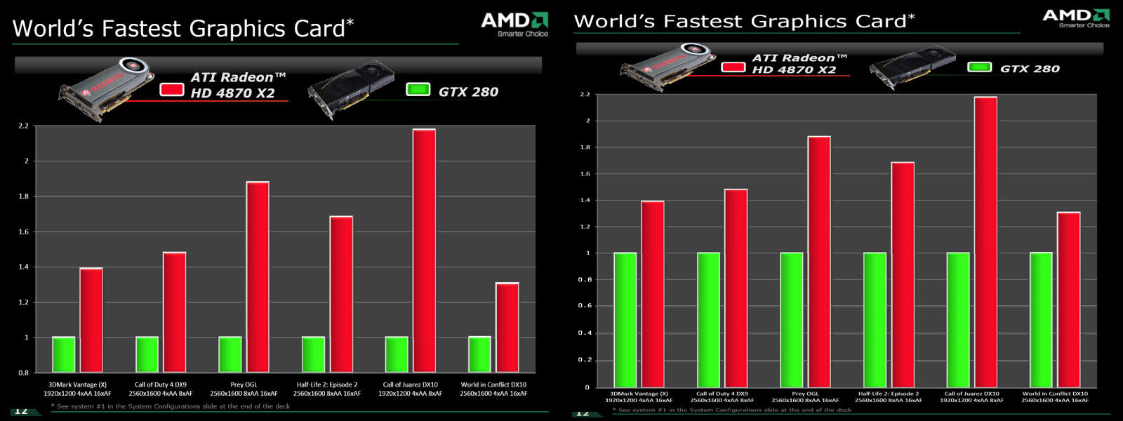 Ami a grafikus kártyák piacát illeti, itt az AMD piacra dobta a Radeon HD 4870 X2 típust, amely állításuk szerint a leggyorsabb versenyző. Bár a GeForce GTX 280 mérete és puszta ereje révén lenyomja az egy vezérlővel szerelt kártyákat, a most megjelent zászlóshajó esetében az erőviszonyok megváltoztak. A jól sikerült chip megfelelő teljesítményt nyújt elfogadható fogyasztással, elemzők szerint pedig a vezérlők közötti gyorsabb, javított kommunikáció révén az AMD a duplázás esetén 1,8-szoros teljesítménynövekedést célozhat meg, amely négy chip egyidejű használatakor 2,5-szeres szorzót jelent majd - ez mindenképpen jobb az eddigieknél.