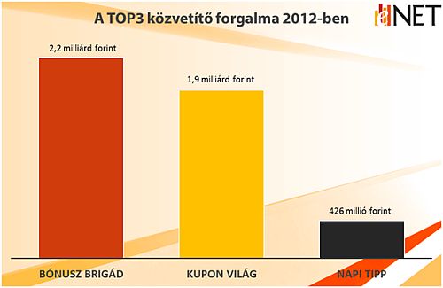 A legnagyobb értékesítők egyenként havi szinten is már több százmillió forintos forgalmat bonyolítottak, melynek köszönhetően 2012-ben a legnagyobb árbevételt a Bónusz Brigád érte el, több mint 2,2 milliárd forintot érő eladott bónusszal, második helyen a Kupon Világ áll, csaknem 1,9 milliárd forintnyi értékesített kuponnal. A dobogó harmadik fokára pedig 2012-ben is a Napi Tipp állhatott fel 426 millió forintos éves forgalommal. Az eNET által monitorozott cégek 2012-ben összesen mintegy 12 ezer ajánlatot hirdettek meg és több mint egymillió bónuszt/kupont értékesítettek együttesen 6,5 milliárd forint értékben, átlagosan 55%-os kedvezménnyel. Mindez azt is jelenti, hogy ha a kínált szolgáltatások és termékek eredeti árát vesszük alapul, akkor a valódi érték 11,8 milliárd Ft lenne, vagyis a fogyasztók zsebében 5,3 milliárd forint maradt megtakarításként.