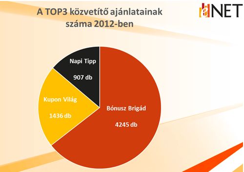 A teljes piac 12 ezer ajánlatából 6500 db köthető az első három szereplőhöz, ennek 65%-át a Bónusz Brigád teszi ki a maga 4200 ajánlatával – a piacvezetőnek így önmagában közel kétszer annyi ajánlata volt 2012-ben, mint a második és harmadik szereplőnek együttvéve. Összességében a 2012-ben meghirdetett összes ajánlat 35%-át a Bónusz Brigád, 12%-át a Kupon Világ és 8%-át a Napi Tipp adta. Az eladások terén is túlsúlyban van az első három cég, köszönhetően a 775 ezer eladott bónusznak/kuponnak, mely 72%-át adja a teljes piac éves eredményének. A Bónusz Brigád egymaga 55 ezerrel több bónuszt értékesített, mint a Kupon Világ és a Napi Tipp együttesen, a piacvezető adta így a vizsgált bónuszok/kuponok 54%-át.