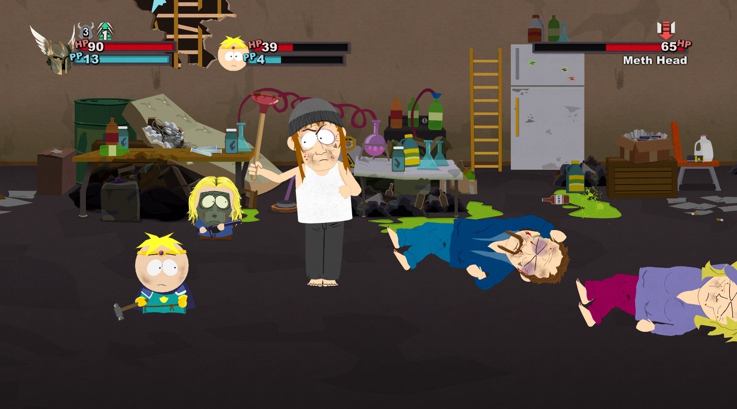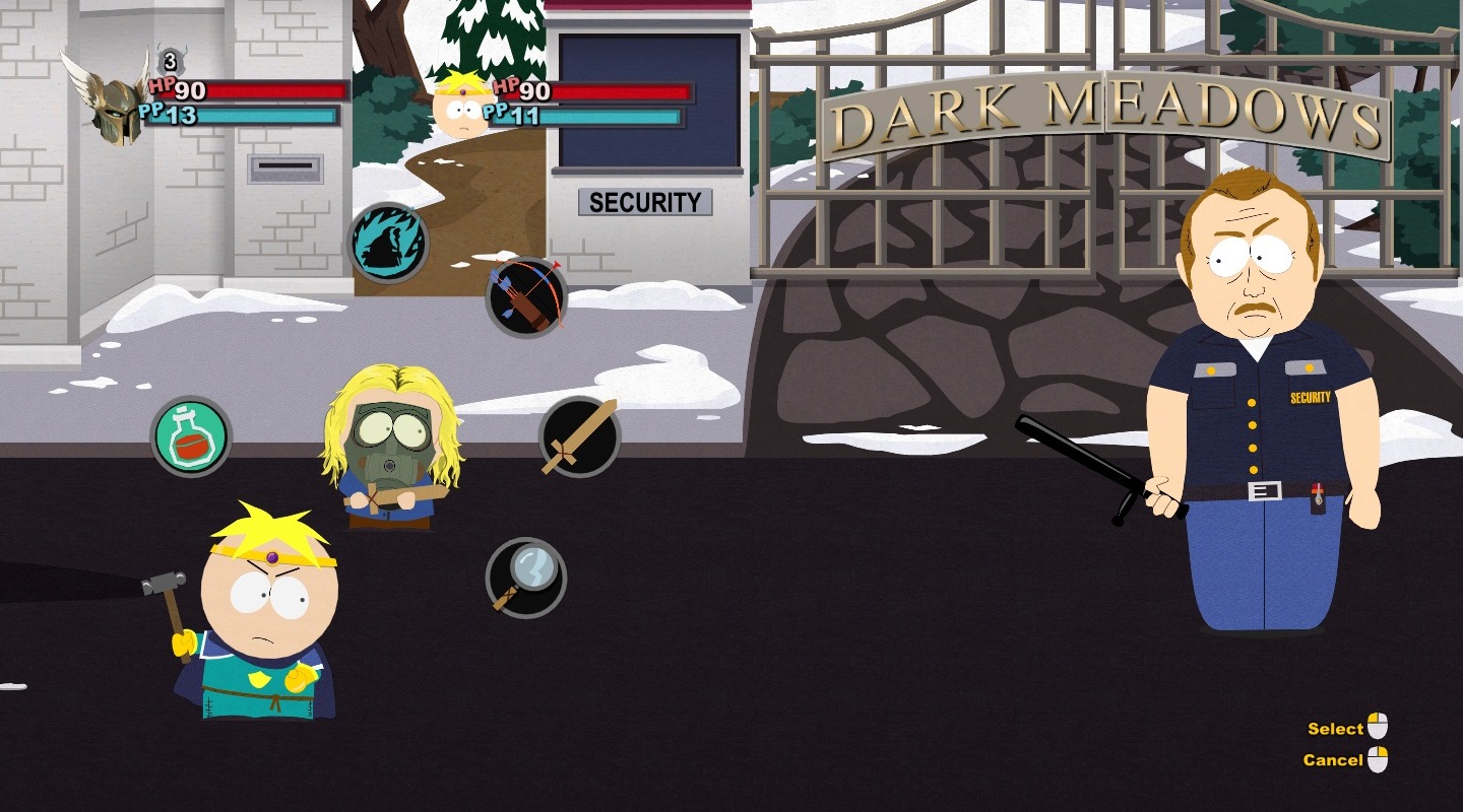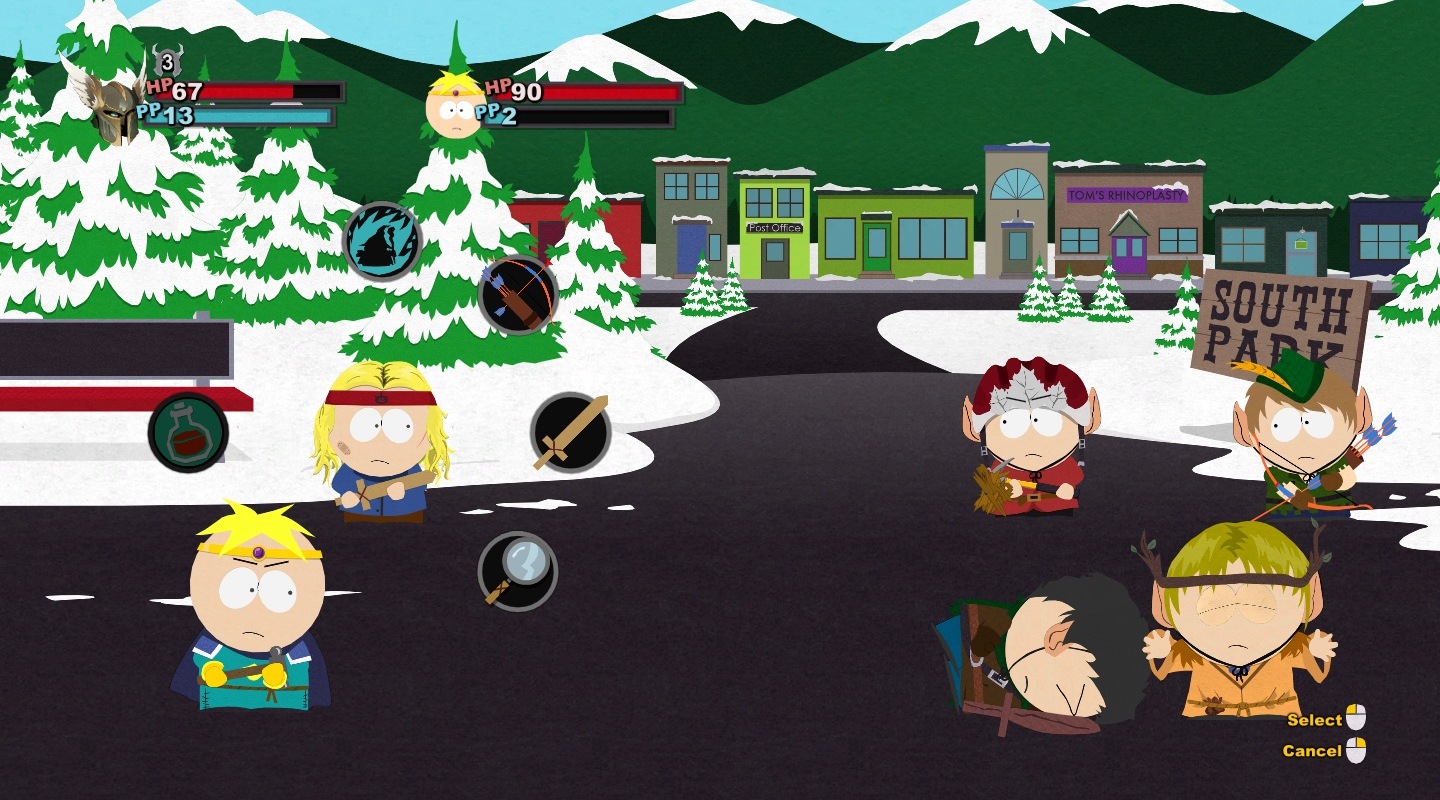 A harc ugyanis a South Park: The Stick of Truth egyik központi eleme lett, és mint olyan, a fejlesztők természetesen ügyeltek arra, hogy még a sokadik összecsapás is tartogasson meglepetéseket. Ez ugyan nem sikerült maradéktalanul, de az oldalnézetben zajló körökre osztott küzdelmek garantáltan mindig képesek mosolyt csalni az arcunkra még a magasabb szinteken is. Függetlenül attól, hogy többszörös túlerővel, felnőttekkel, netán főellenfelekkel van dolgunk, a harctéren általában egy segédünk lehet, így előbb Butters, majd Kenny, később pedig akár még Cartman is választható lesz - természetesen a teljesség igénye nélkül.