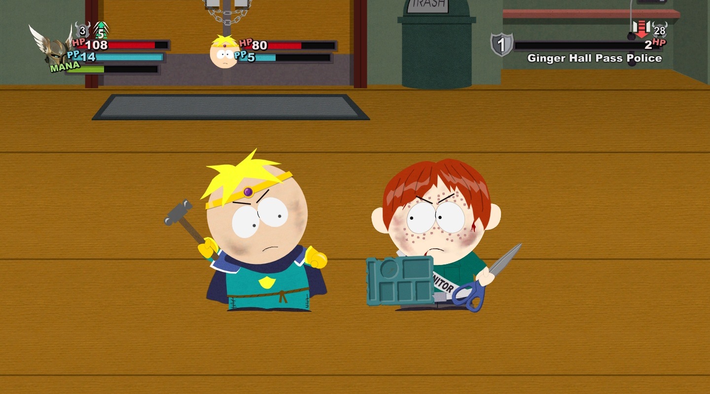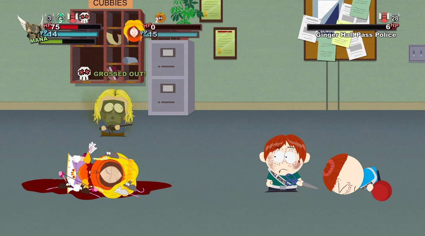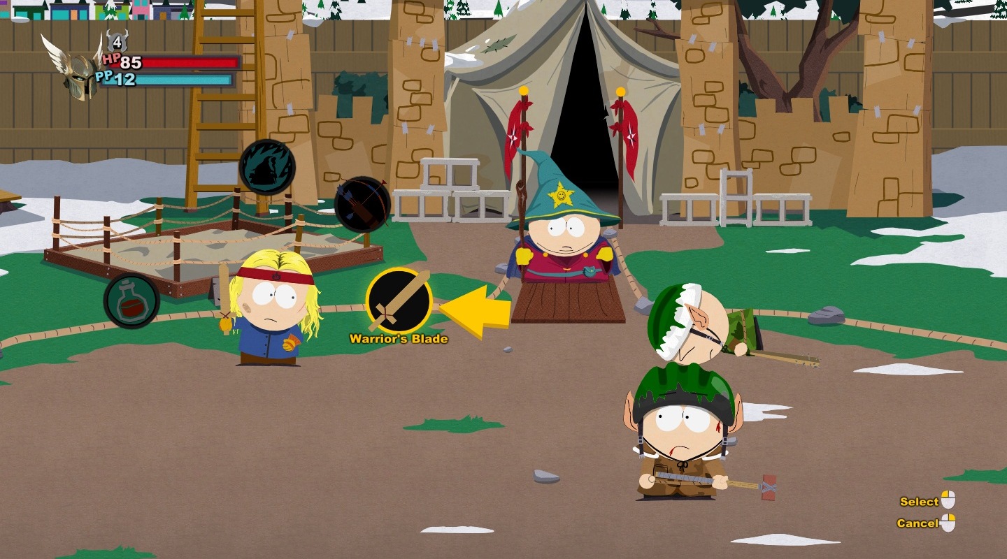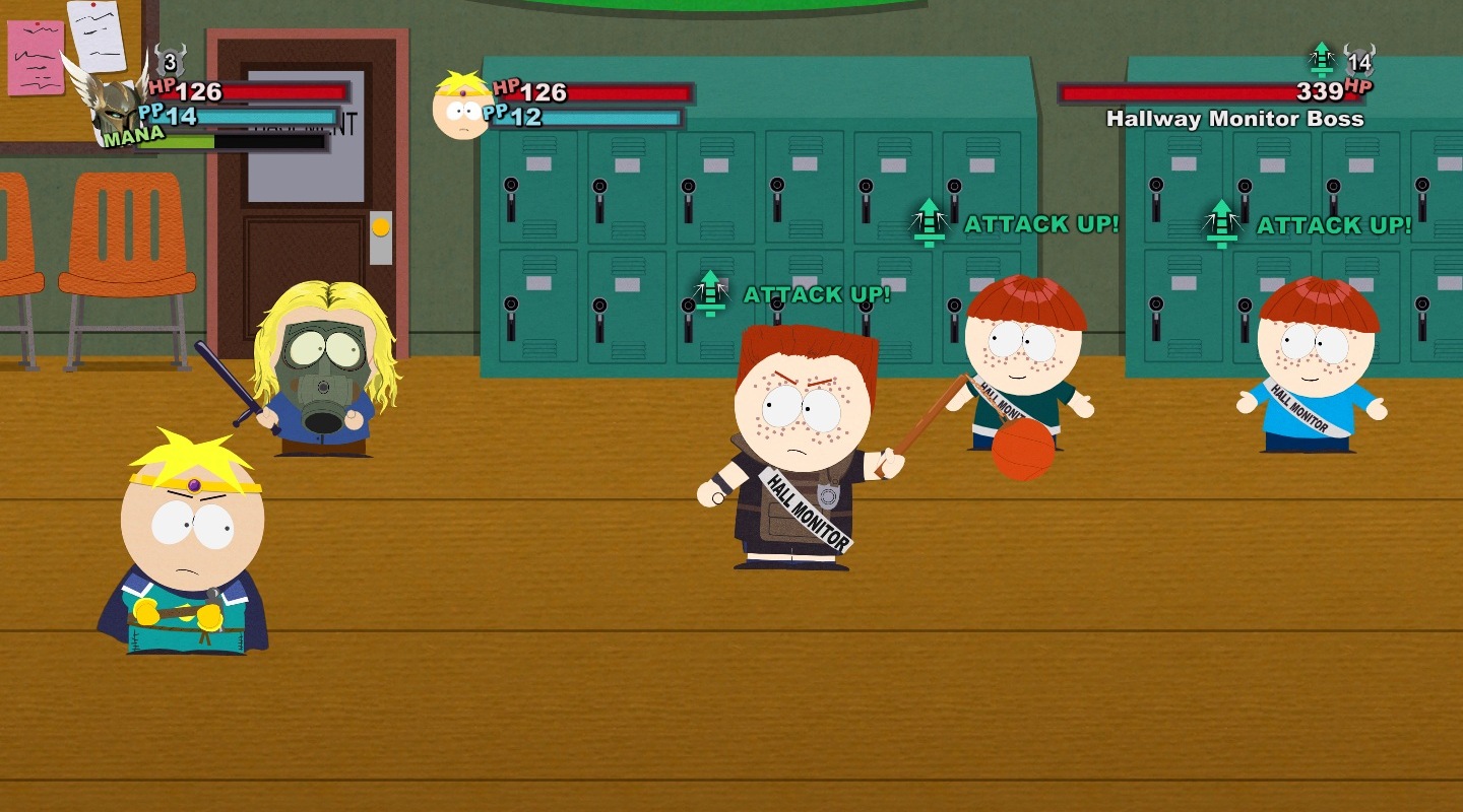 A harc ugyanis a South Park: The Stick of Truth egyik központi eleme lett, és mint olyan, a fejlesztők természetesen ügyeltek arra, hogy még a sokadik összecsapás is tartogasson meglepetéseket. Ez ugyan nem sikerült maradéktalanul, de az oldalnézetben zajló körökre osztott küzdelmek garantáltan mindig képesek mosolyt csalni az arcunkra még a magasabb szinteken is. Függetlenül attól, hogy többszörös túlerővel, felnőttekkel, netán főellenfelekkel van dolgunk, a harctéren általában egy segédünk lehet, így előbb Butters, majd Kenny, később pedig akár még Cartman is választható lesz - természetesen a teljesség igénye nélkül.