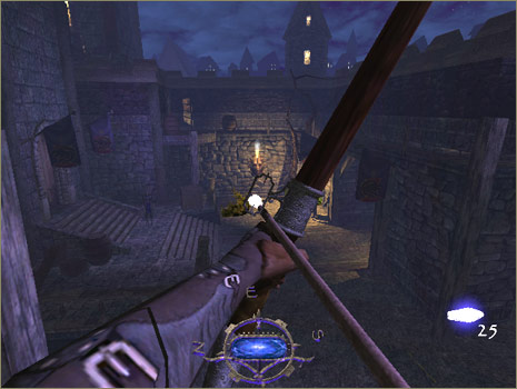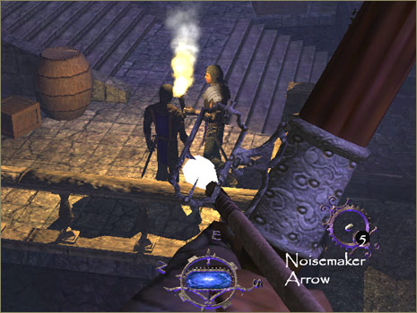 Távolabbi célok eléréséree leakaszthatjuk a vállunkról az íjjat. A tegezünkben előfordulhat a hagyományos nyíl mellett hangkeltő verzió, amit egy helyre kilőve működésre bírhatunk. Tűzes nyíllal begyújthatunk akár egy lőporos hordót is, ha meggondolnánk magunkat, akkor a vizes nyíllal "javíthatunk".