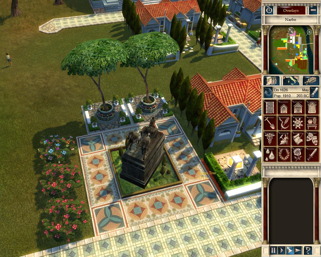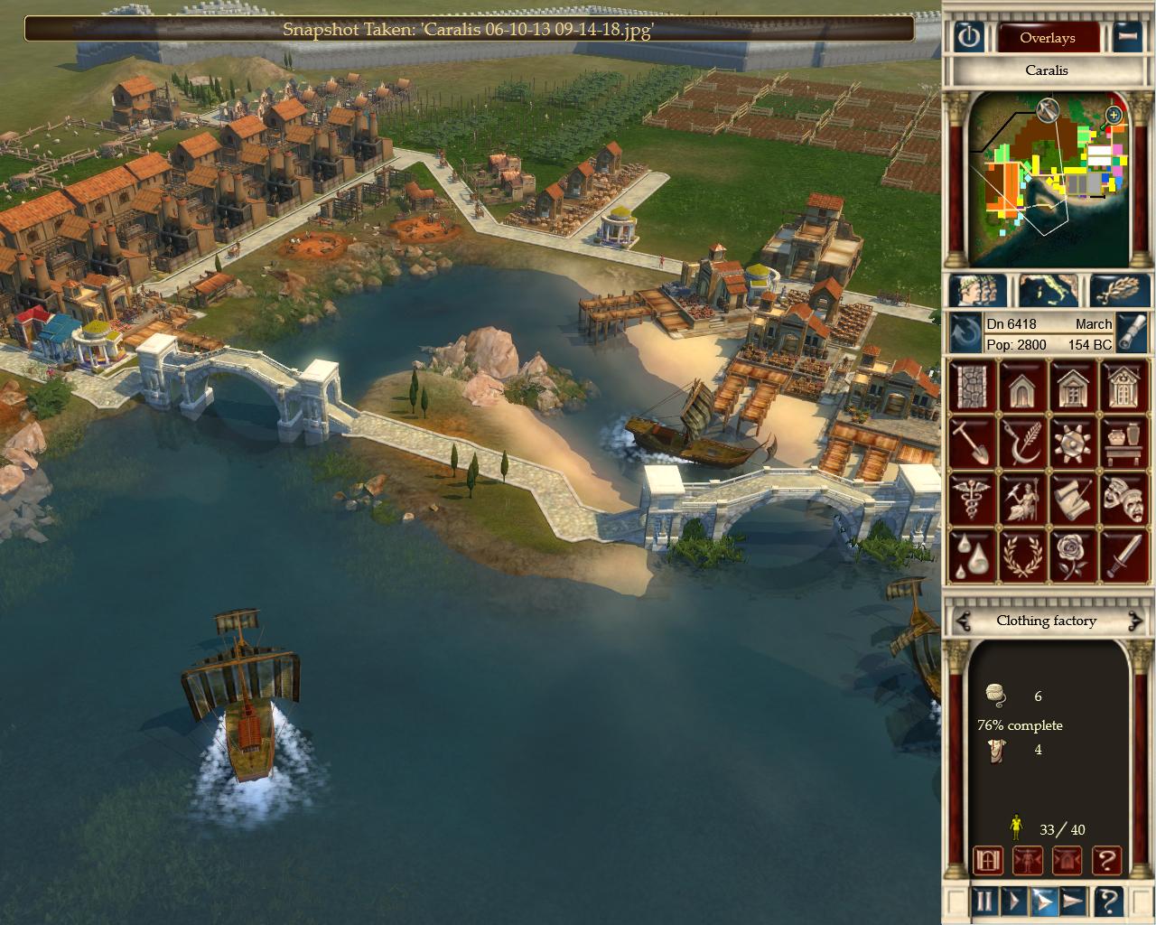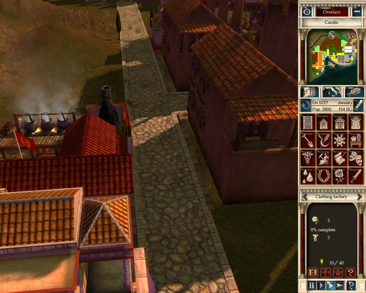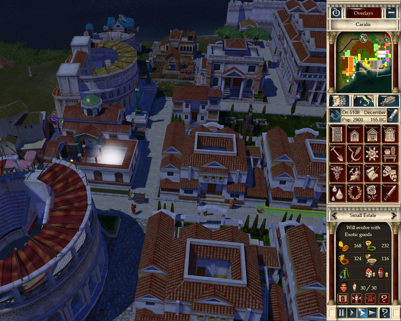 Ha már stabilizálódott a gazdaságunk, akkor rátérhetünk a fejlesztésre, színház, aréna, könyvtár, extra termékek gyártása, szobrok, parkok emelése, cifrázás. Ilyenkorra már a Cézár biztosan többször lesarcolt minket valamivel, ami általában a helyi adottságoknak megfelelő kérés, tehát ha egy bőtermő szcenáriót lakunk be épp, akkor valószínű, hogy búzát kér, ha egy kereskedelmi csomópont építése a cél, akkor pénzt, ha pedig invázió vagy védelem a feladat, akkor a sereget kell megtámogatni kicsit.