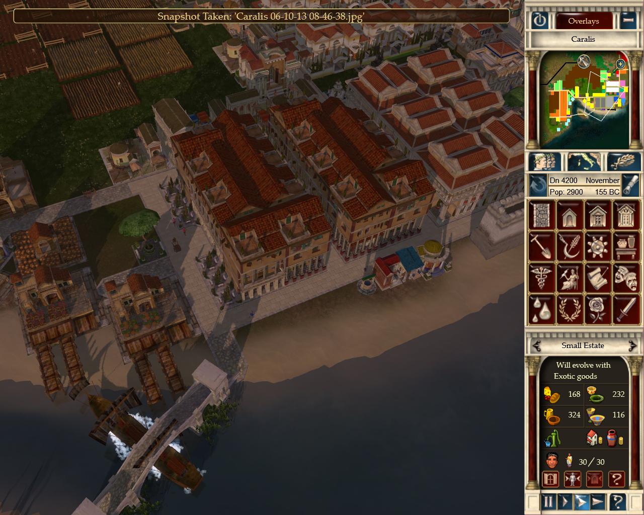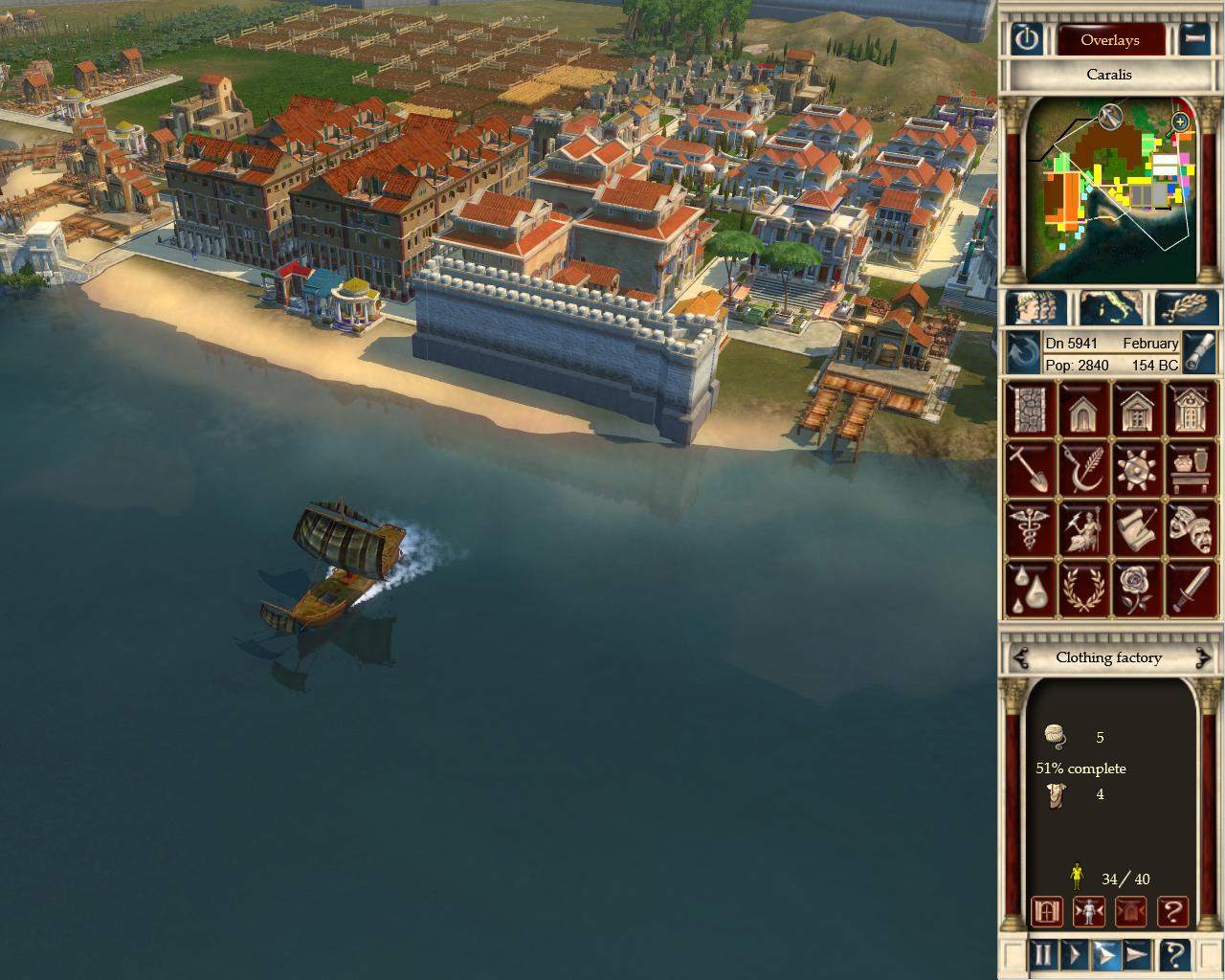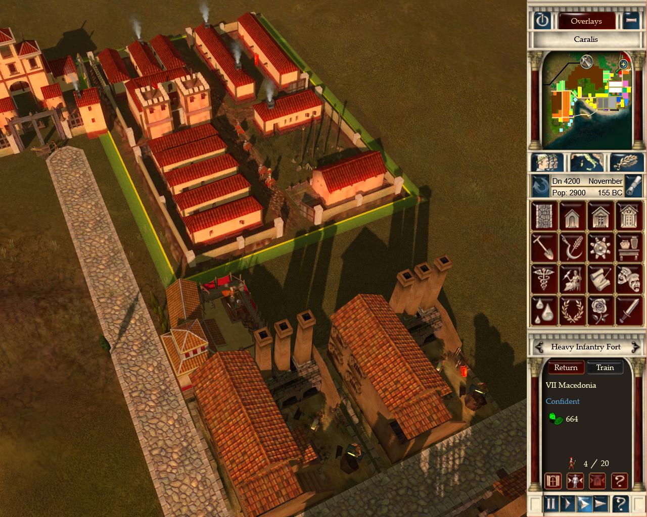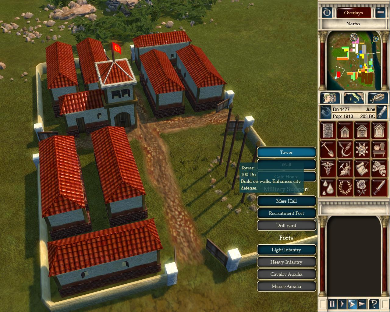 Ha már stabilizálódott a gazdaságunk, akkor rátérhetünk a fejlesztésre, színház, aréna, könyvtár, extra termékek gyártása, szobrok, parkok emelése, cifrázás. Ilyenkorra már a Cézár biztosan többször lesarcolt minket valamivel, ami általában a helyi adottságoknak megfelelő kérés, tehát ha egy bőtermő szcenáriót lakunk be épp, akkor valószínű, hogy búzát kér, ha egy kereskedelmi csomópont építése a cél, akkor pénzt, ha pedig invázió vagy védelem a feladat, akkor a sereget kell megtámogatni kicsit.