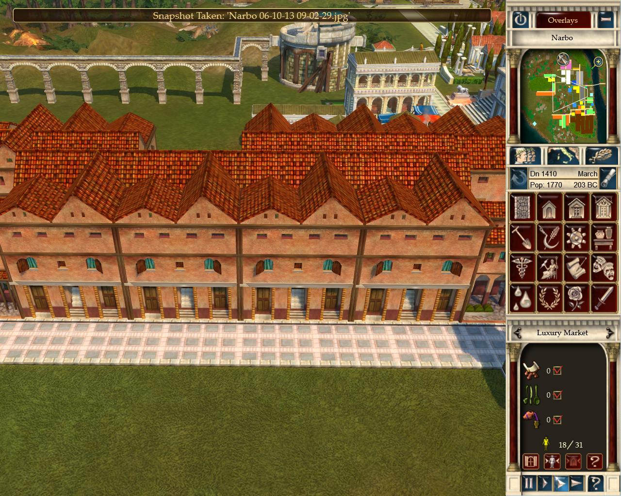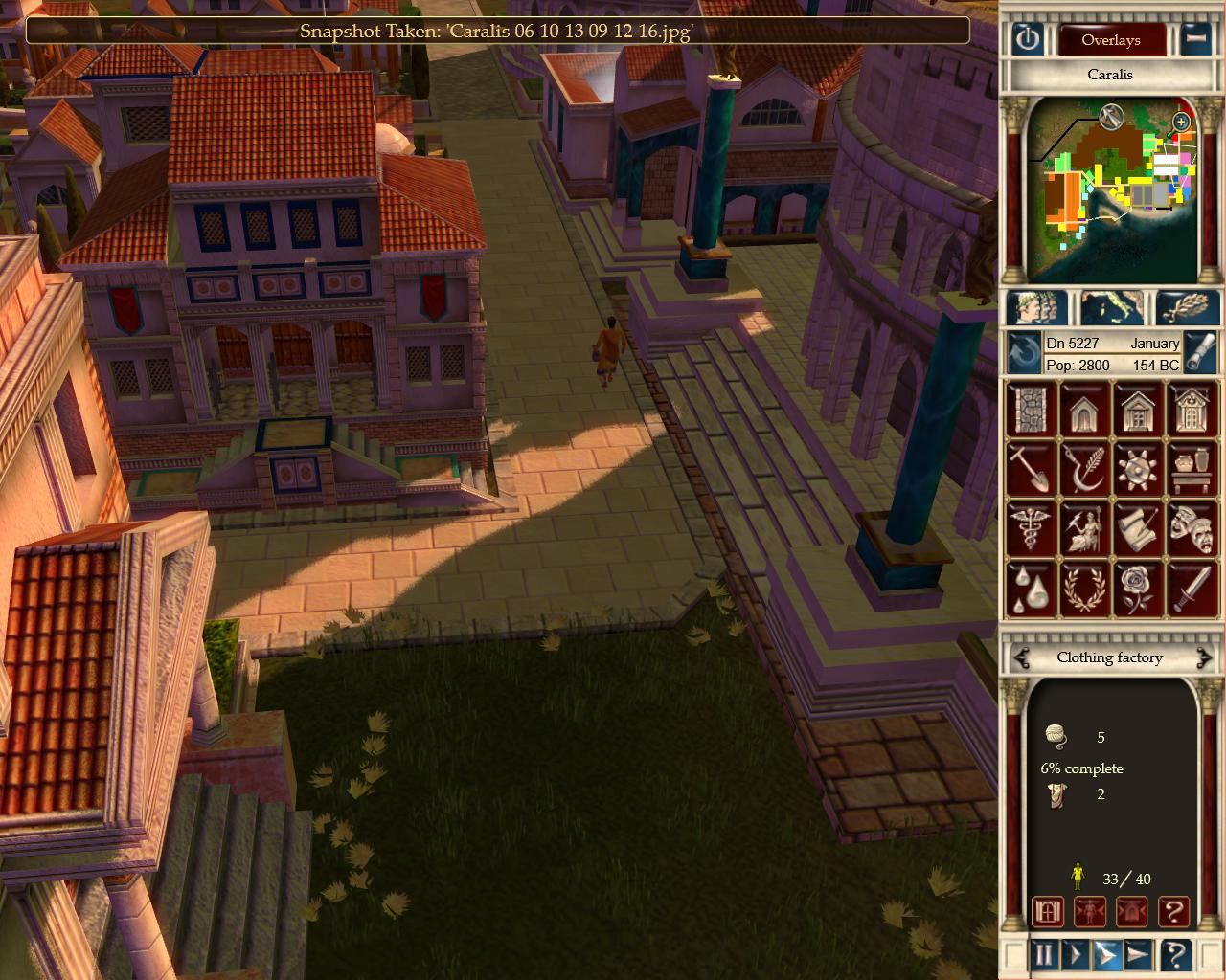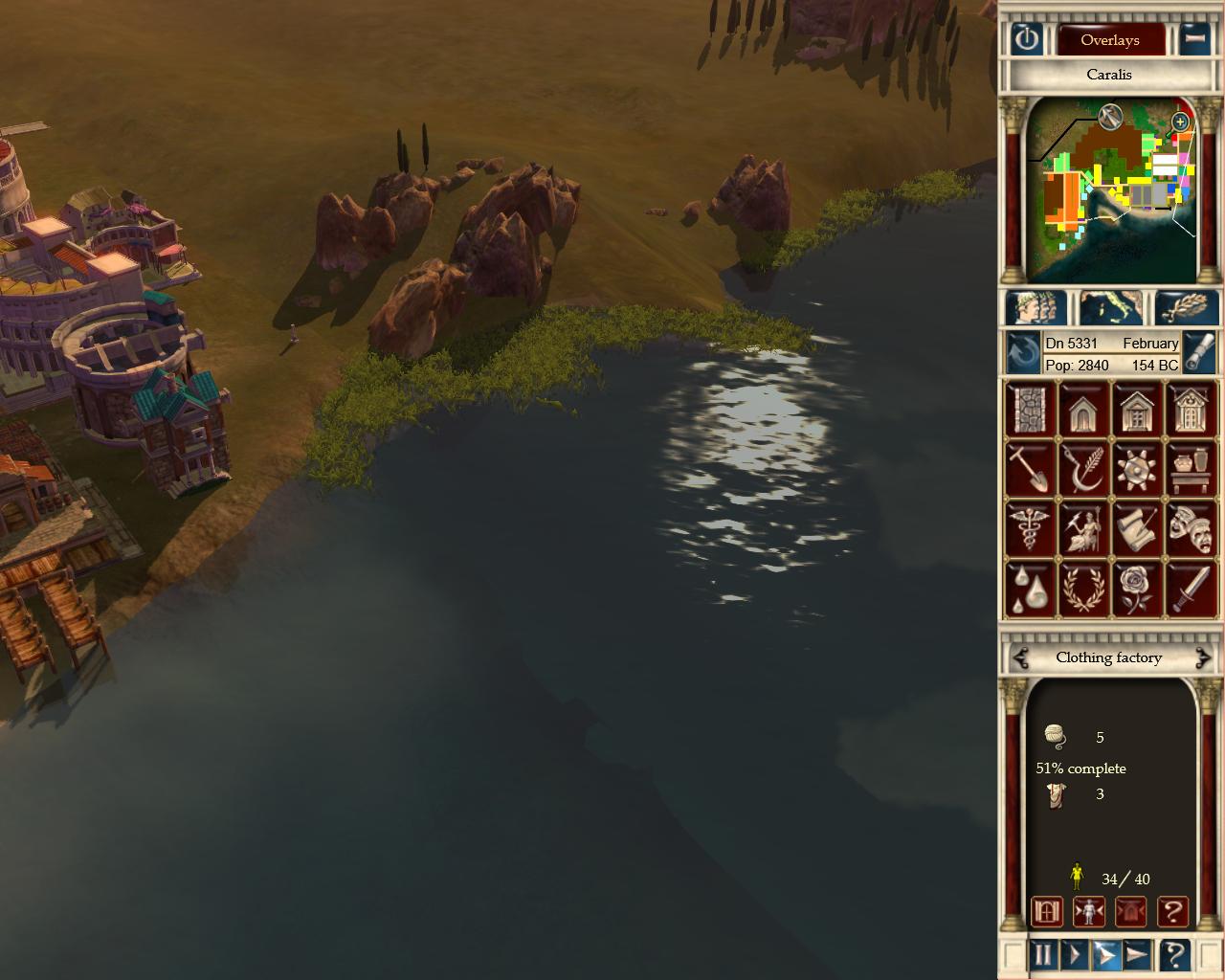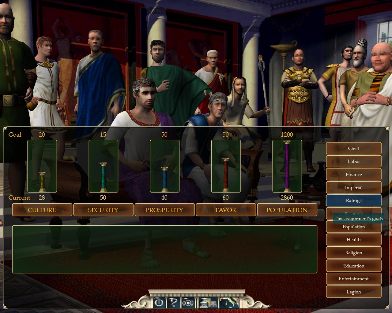 Ha már stabilizálódott a gazdaságunk, akkor rátérhetünk a fejlesztésre, színház, aréna, könyvtár, extra termékek gyártása, szobrok, parkok emelése, cifrázás. Ilyenkorra már a Cézár biztosan többször lesarcolt minket valamivel, ami általában a helyi adottságoknak megfelelő kérés, tehát ha egy bőtermő szcenáriót lakunk be épp, akkor valószínű, hogy búzát kér, ha egy kereskedelmi csomópont építése a cél, akkor pénzt, ha pedig invázió vagy védelem a feladat, akkor a sereget kell megtámogatni kicsit.