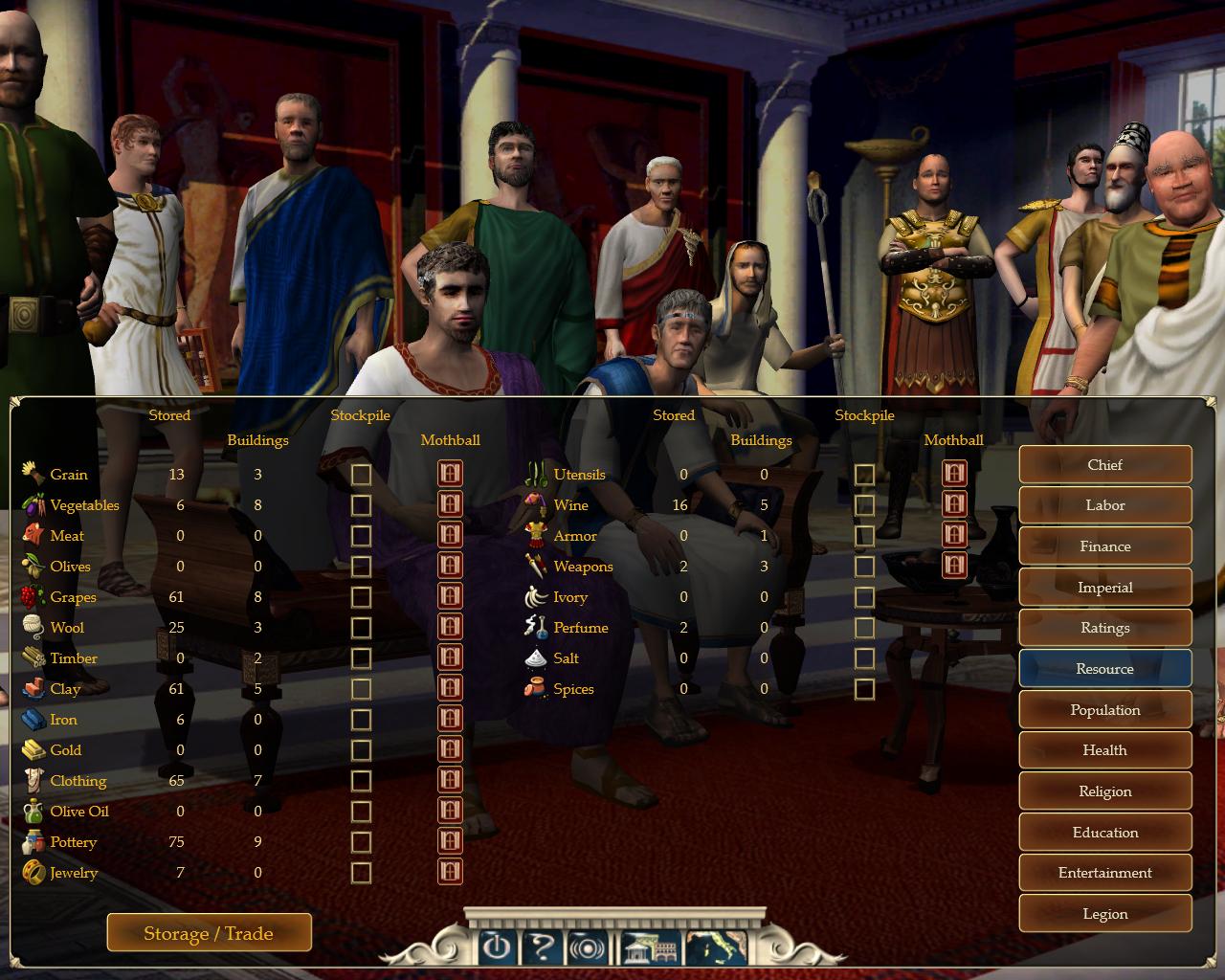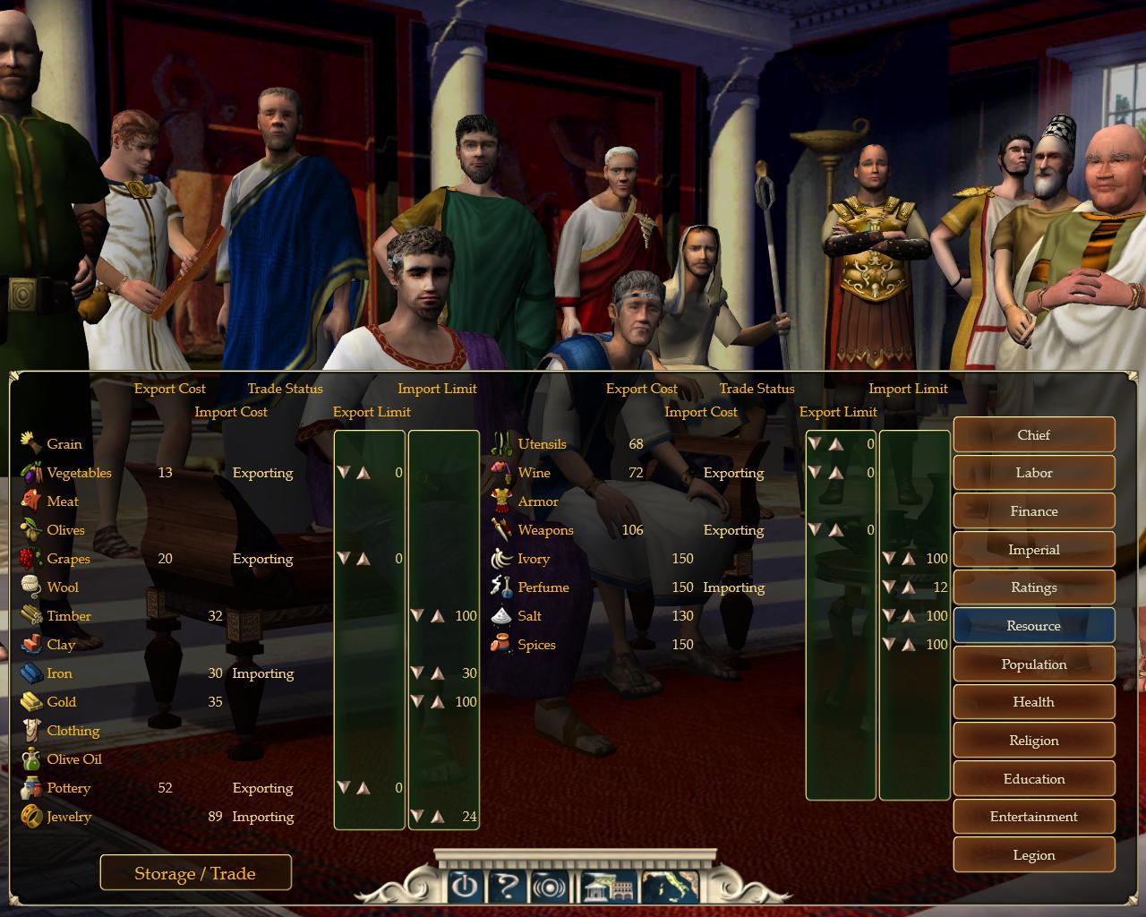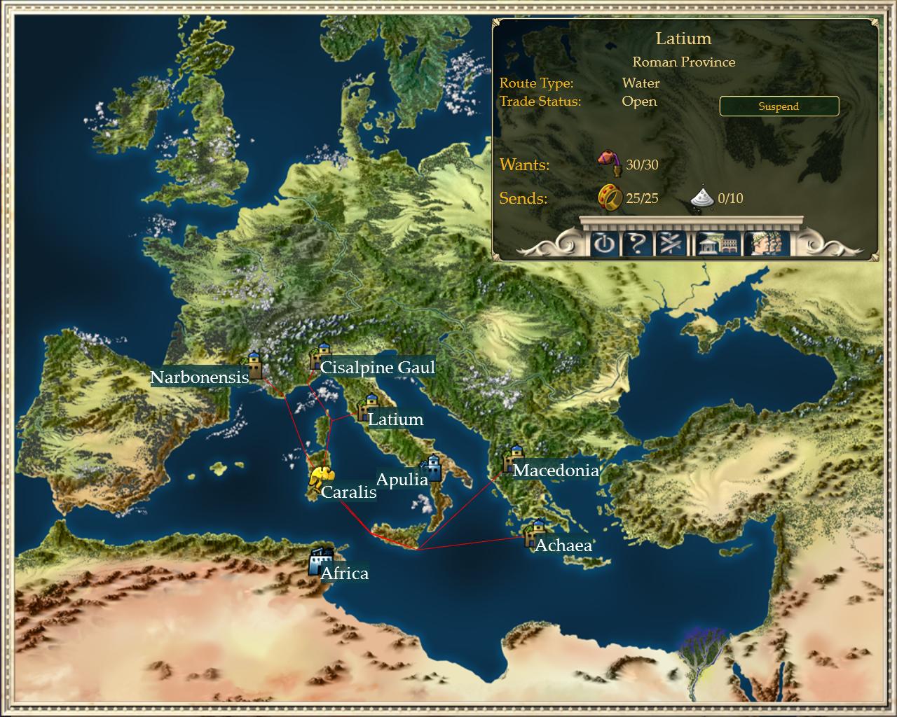 A harmadik és legjövedelmezőbb persze a kereskedelem. A birodalom egyéb városaival kialakíthatunk kereskedelmi útvonalakat, s minden városnak szüksége van valamilyen termékre vagy el tud adni belőle. Érdemes a legelején megnézni, hogy mi az a termék, amit könnyen elő tudunk állítani és lehetőség szerint nagyon sok kell belőle valamelyik városnak, mert ha már az első év végén tudjuk teljesíteni a kvótákat, akkor nem nagyon lesz később anyagi gondunk.
